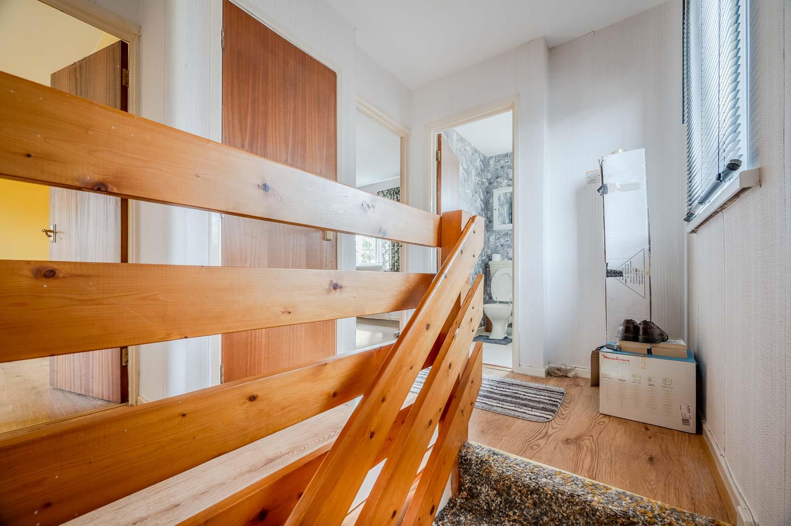 Laminate flooring leading to upstairs cloakroom.