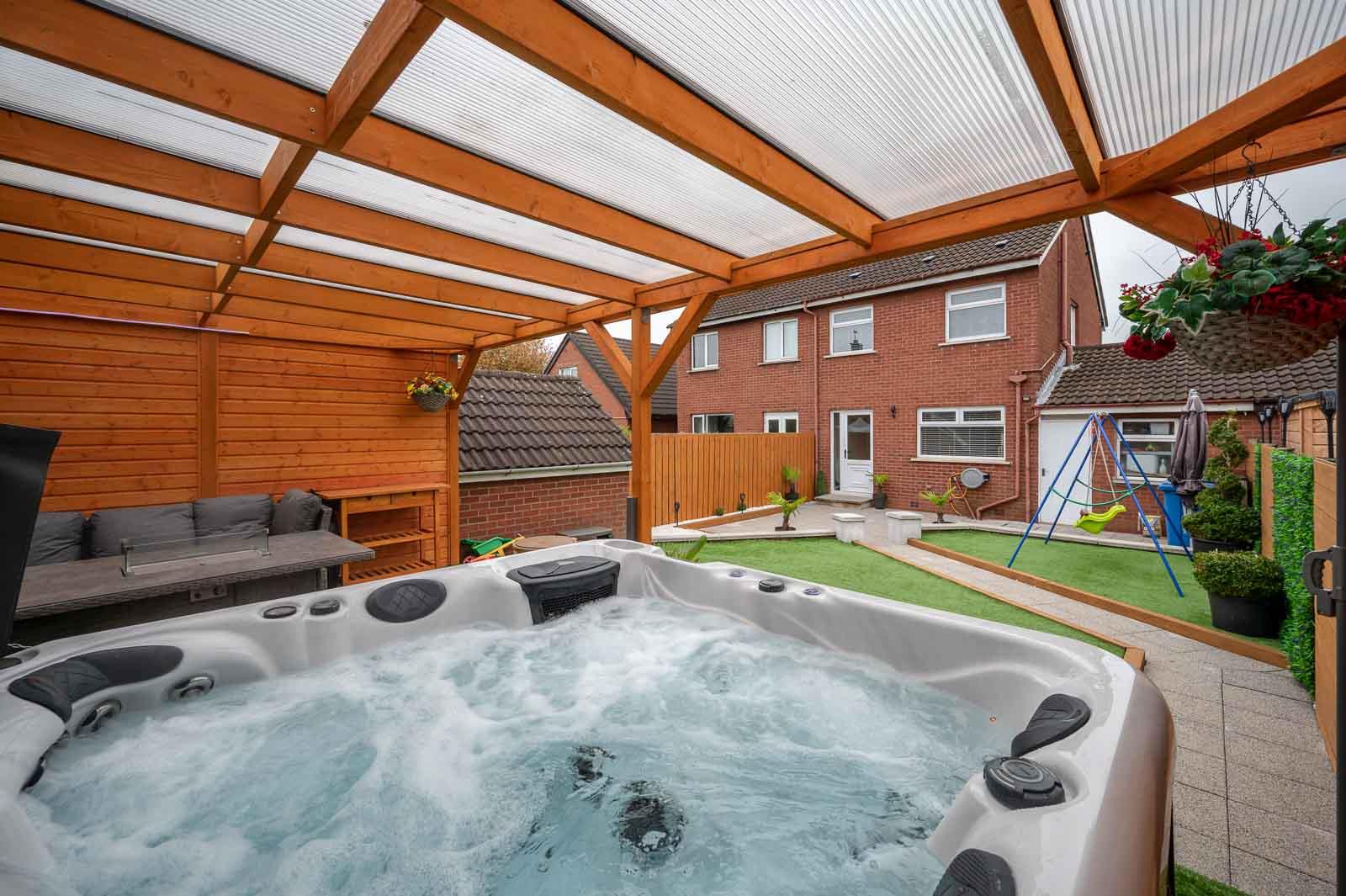 Fully enclosed and beautifully landscaped rear garden featuring astroturf, paved entertaining areas, and decorative, white-pebbled flower beds.