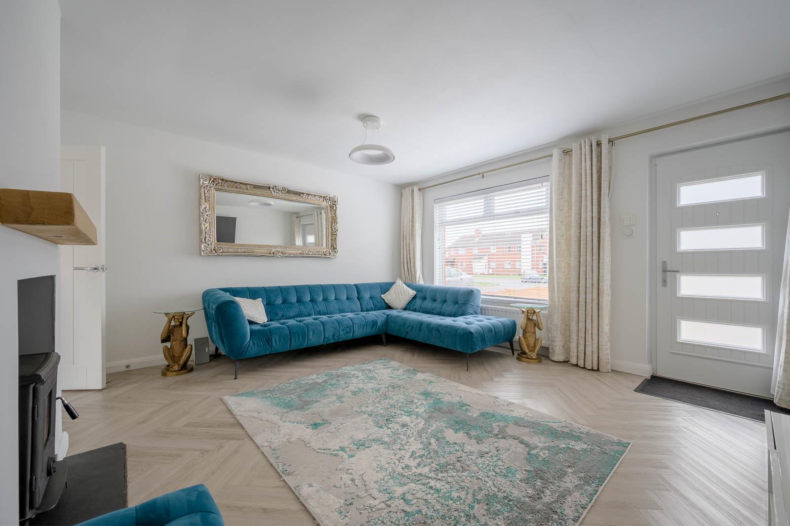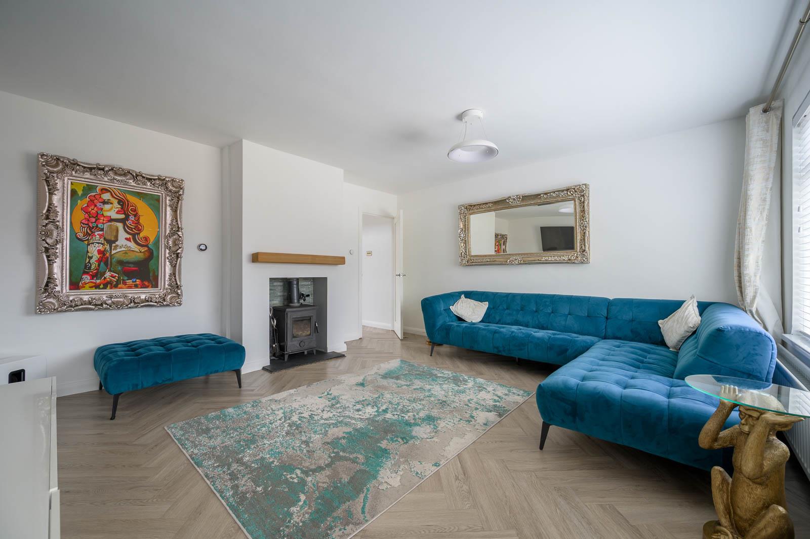 (4.47m x 4.34m) - Elegant wood-effect herringbone flooring complemented by a striking multi-fuel log burner; creating a warm and stylish focal point.