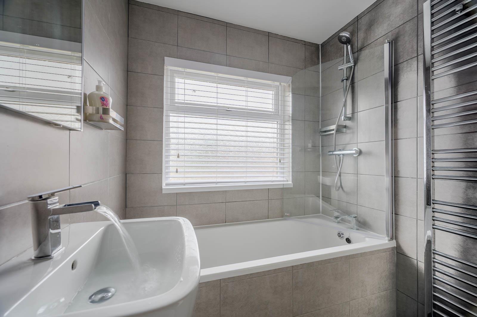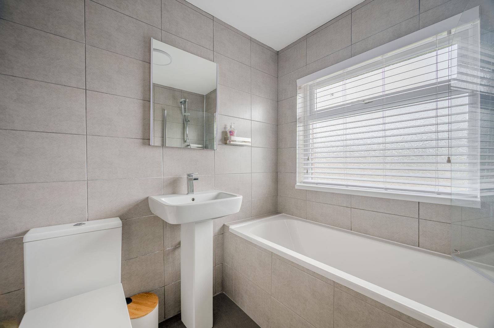 () - Recently renovated with a contemporary white suite comprising a bath with shower combo, low flush WC, and pedestal wash hand basin.