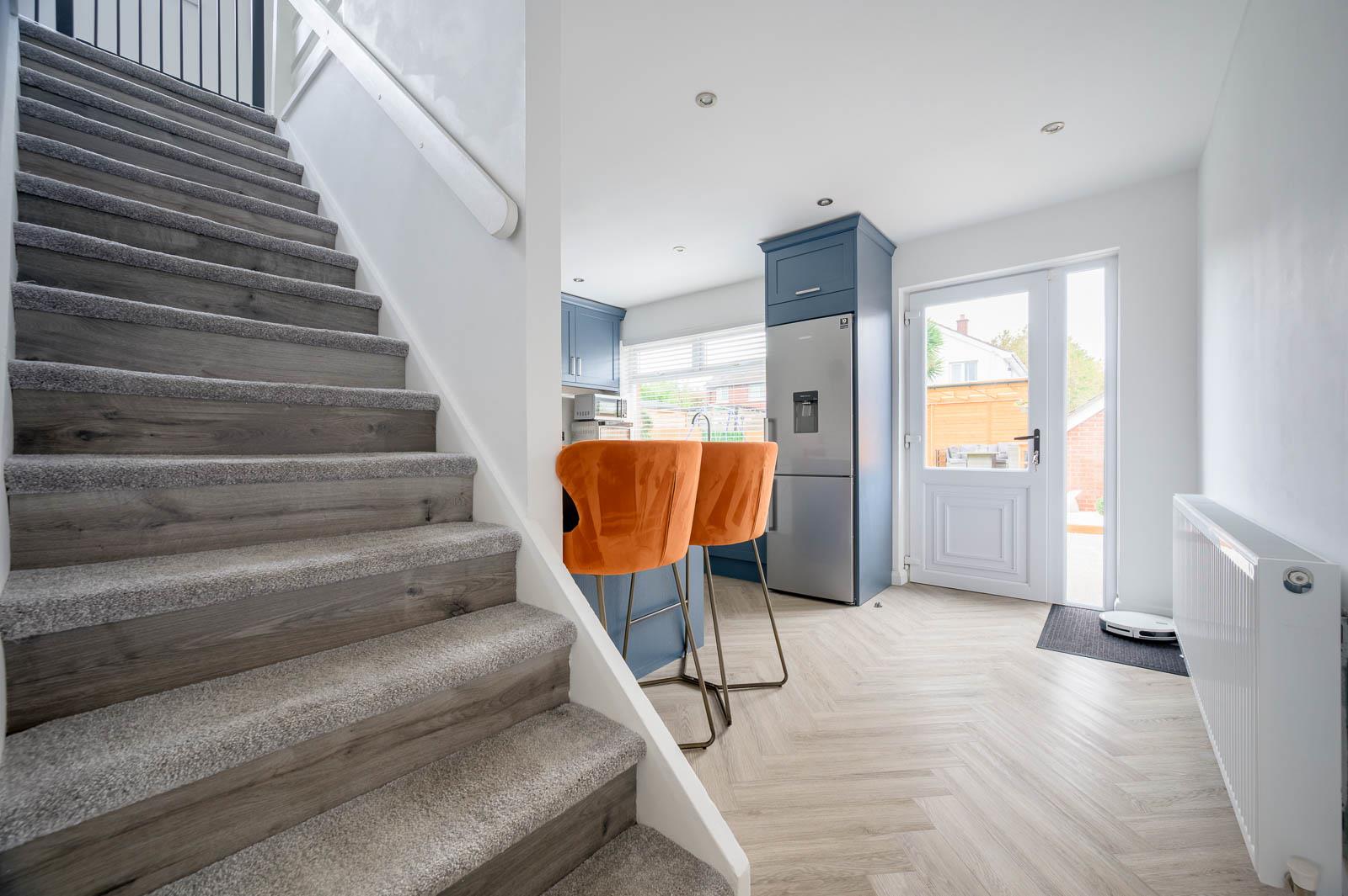 Wood-effect herringbone flooring continues throughout, with an understairs pantry for added convenience.
