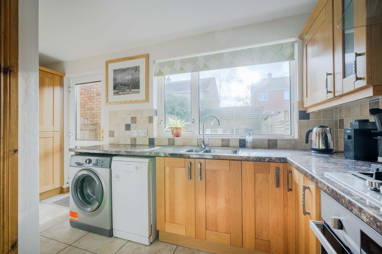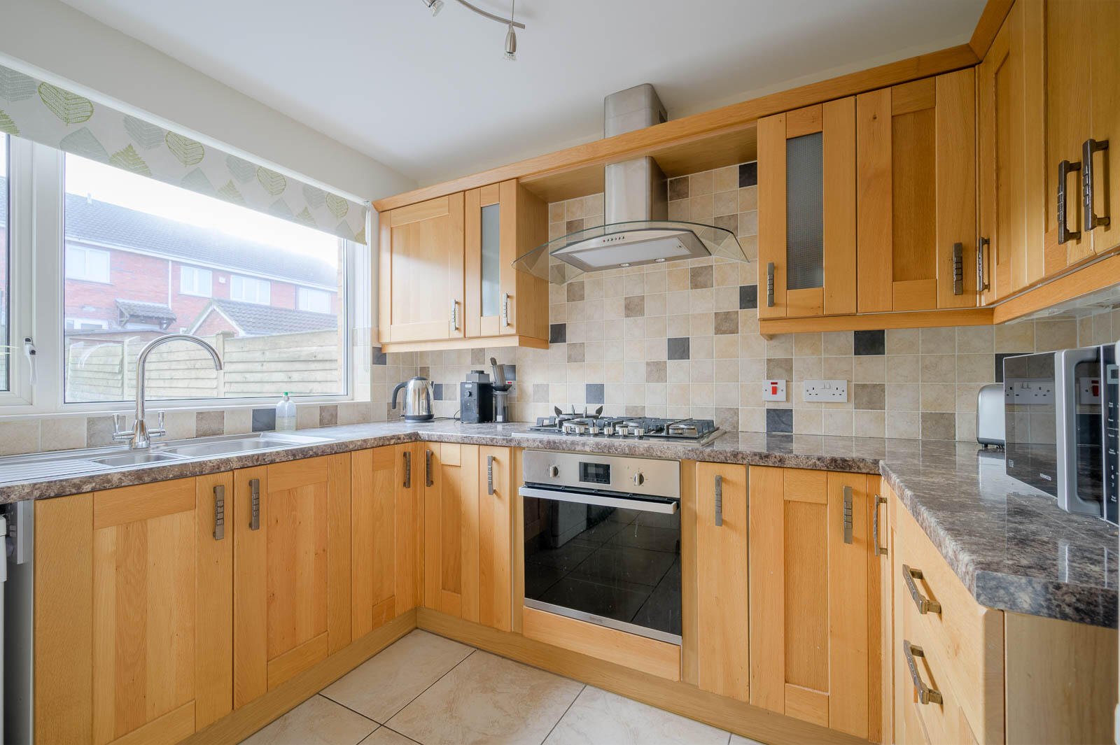 Range of high and low level solid oak units, granite effect work surfaces, Franke one and a half bowl single drainer stainless steel sink unit with mixer tap, integrated five ring Baumatic gas hob, tiled splashback, extractor fan above, integrated Baumatic oven, plumbed for washing machine, plumbed for Slimline dishwasher, space for fridge freezer, glass display cabinets with built-in lighting, fully tiled floor, part tiled walls.