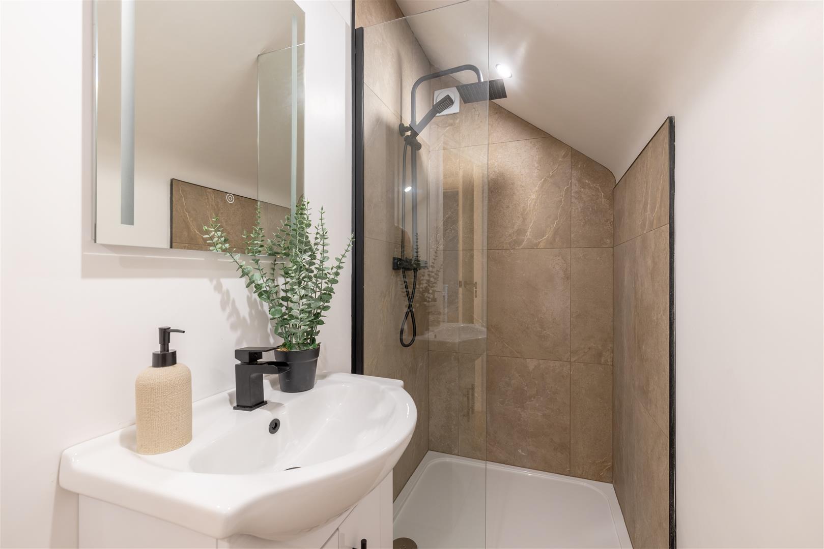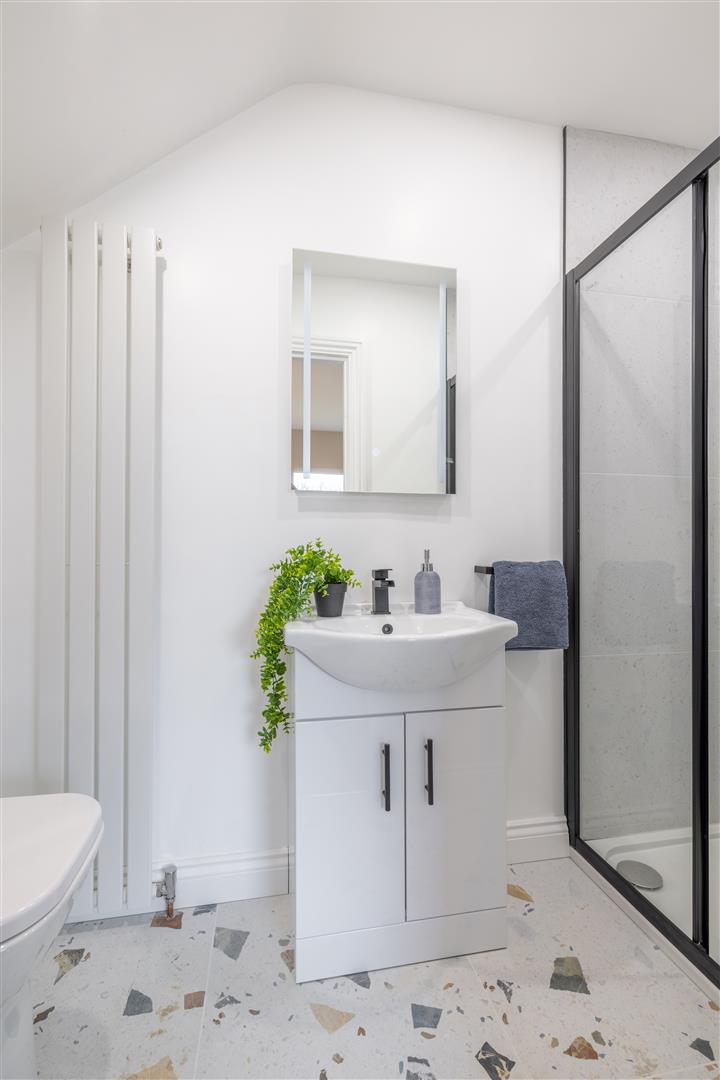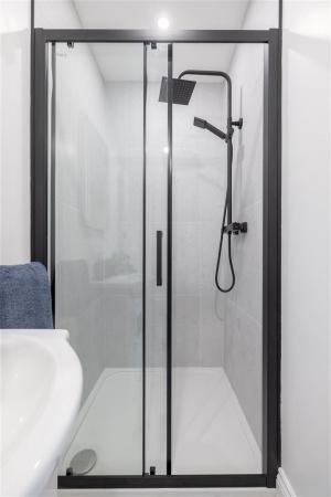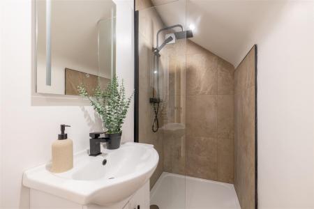 Ensuite Shower Room: - () - Three piece suite comprising built-in fully tiled shower cubicle, low flush WC, wash hand basin with mixer tap, storage beneath, fully tiled floor, extractor fan.