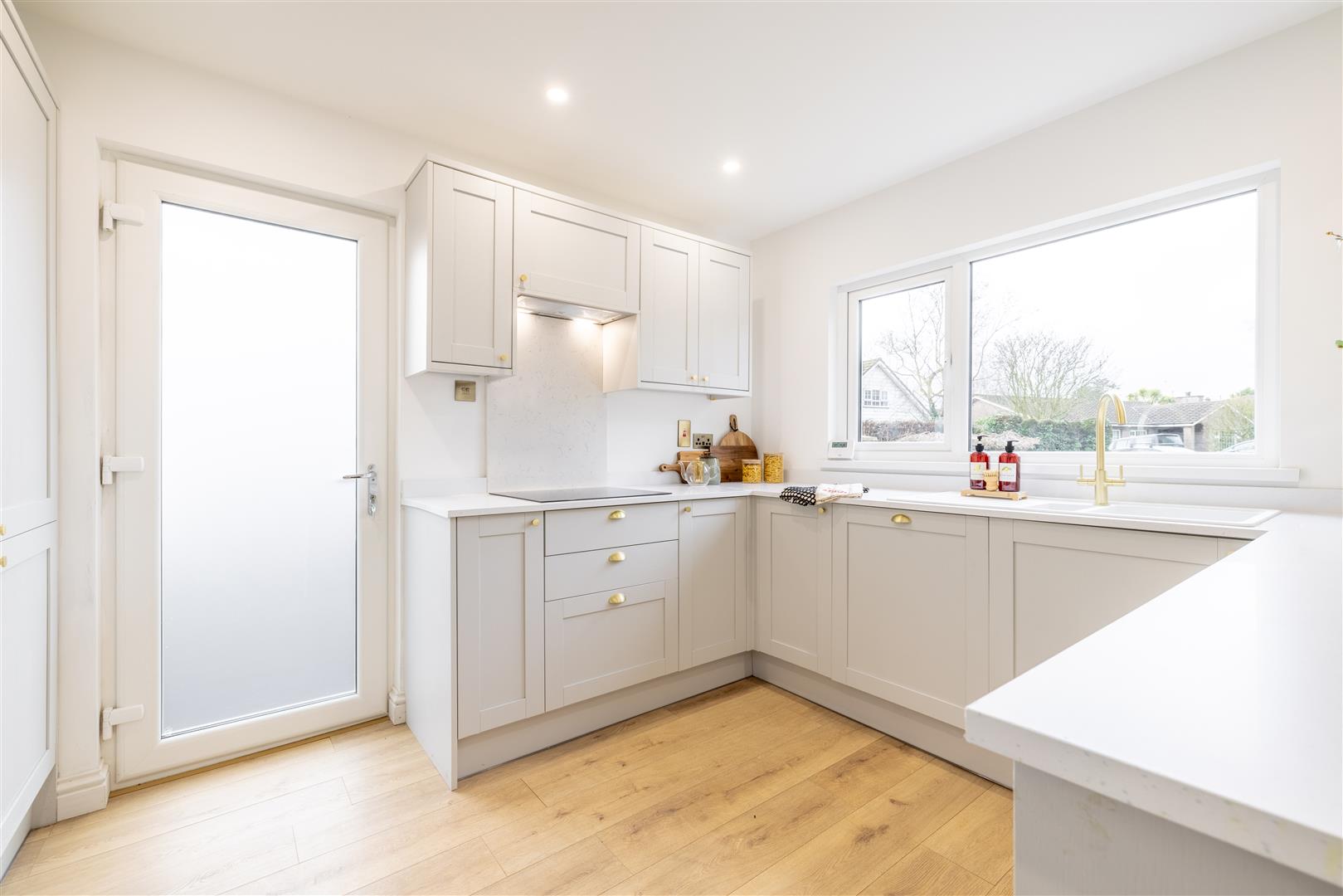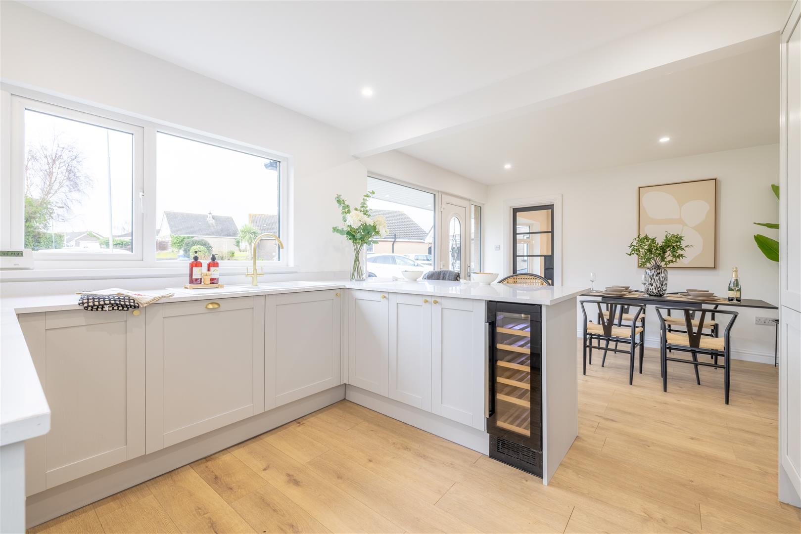 Range of high and low level units, granite effect work surfaces, one and a half bowl single drainer sink unit with mixer tap, integrated four ring hob, splashback, extractor fan above, integrated oven, integrated microwave, integrated dishwasher, integrated fridge freezer, integrated wine cooler, integrated washing machine, laminate wood effect floor, breakfast bar, storage under stairs, uPVC side access door to driveway, open aspect to front.
