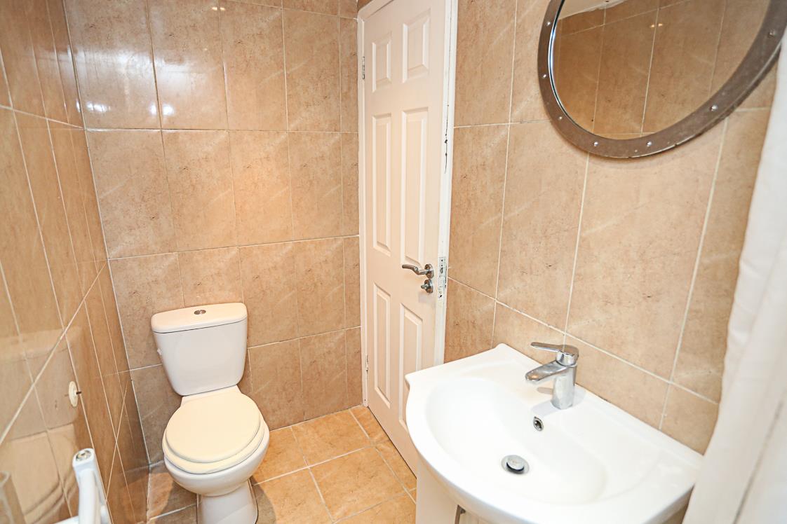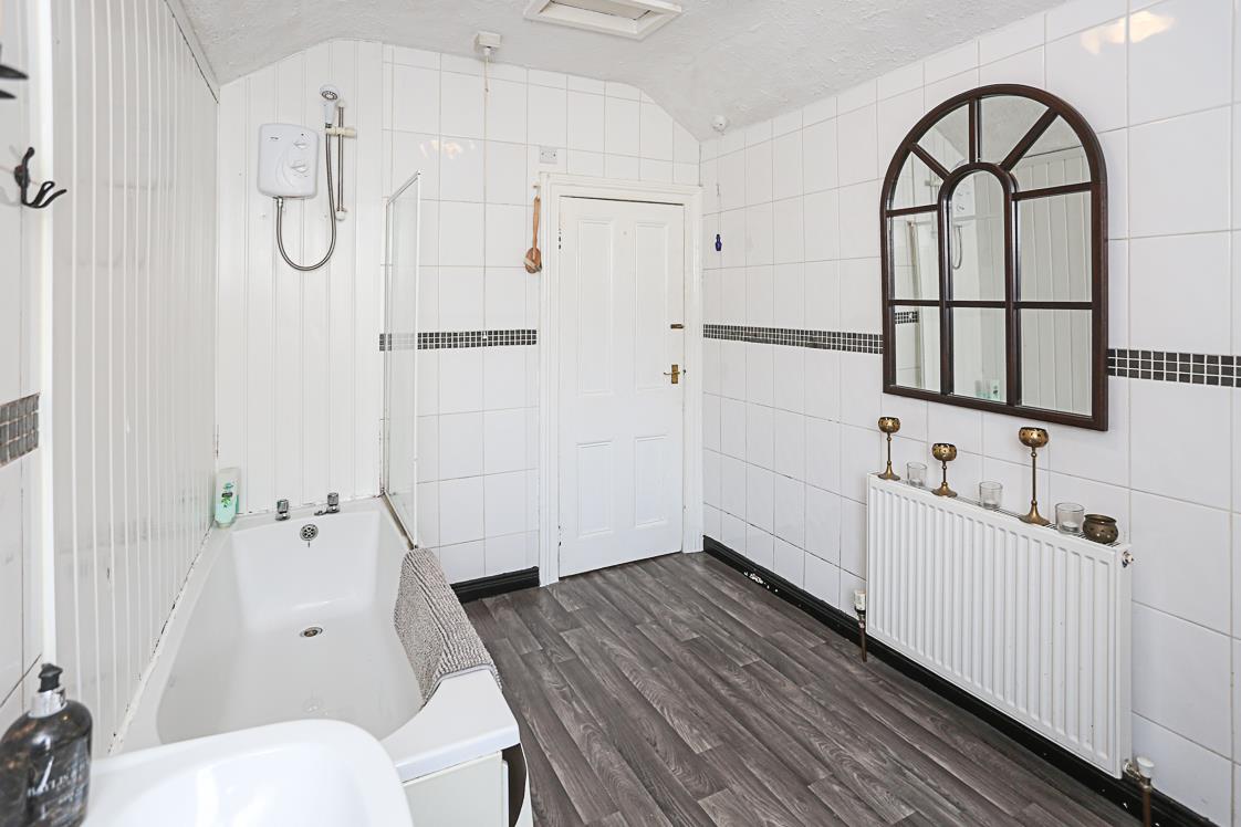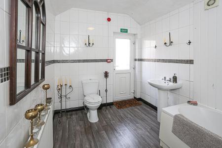 (3.23m x 2.24m) - White suite comprising of low flush WC, pedestal wash hand basin panelled bath with hot and cold taps and electric Mira Sport shower, telephone handle attachment, partially tiled walls, partially panelled walls, linoleum wood effect floor, uPVC and double glazed access door and fire door to outside balcony.