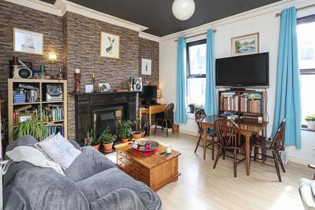 (4.42m x 3.84m) - With dual aspect outlook to front, laminate wood effect floor, ample space for dining and living, with central feature fireplace with marble surround mantel and slate hearth, tile detail, cornice detail bordering.