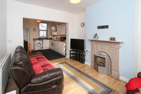 (3.84m x 3.3m) - With laminate wood effect floor, display fireplace with cast iron surround and mantel, outlook to front, open to square arch leading through to kitchen.