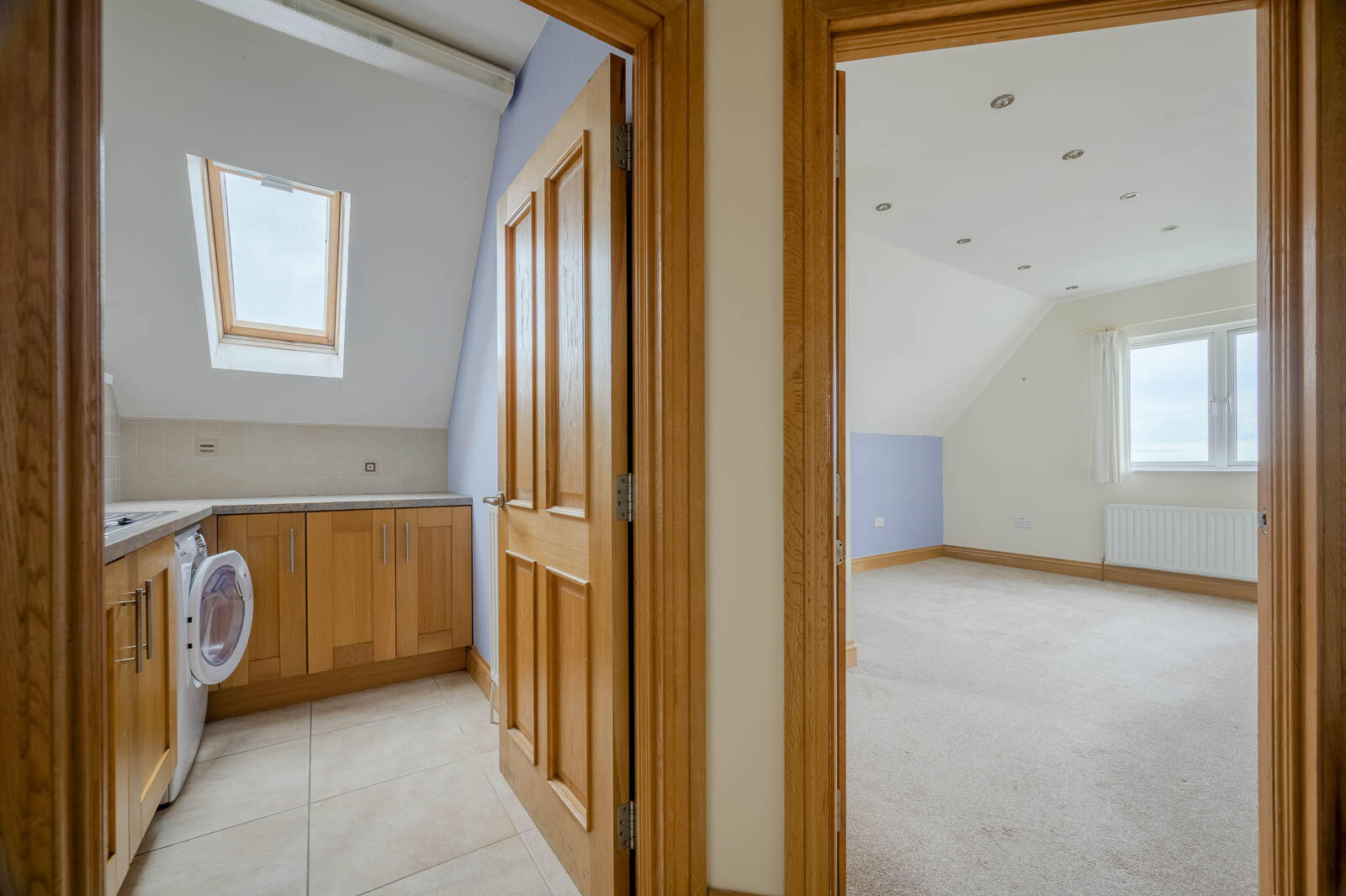 With range of oak Shaker style units, stainless steel fittings, laminate work surface, single drainer stainless steel sink unit with chrome mixer tap, plumbed for washing machine, concealed Ideal gas fired boiler, range of low level units, built-in shelving, ceramic tiled floor, Velux window and part tiled walls.