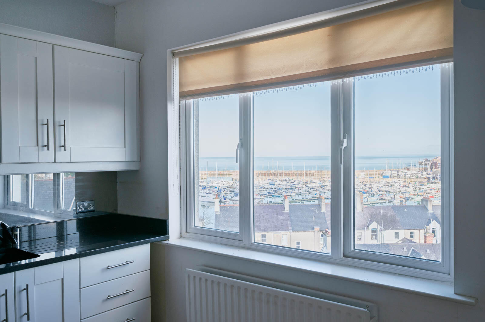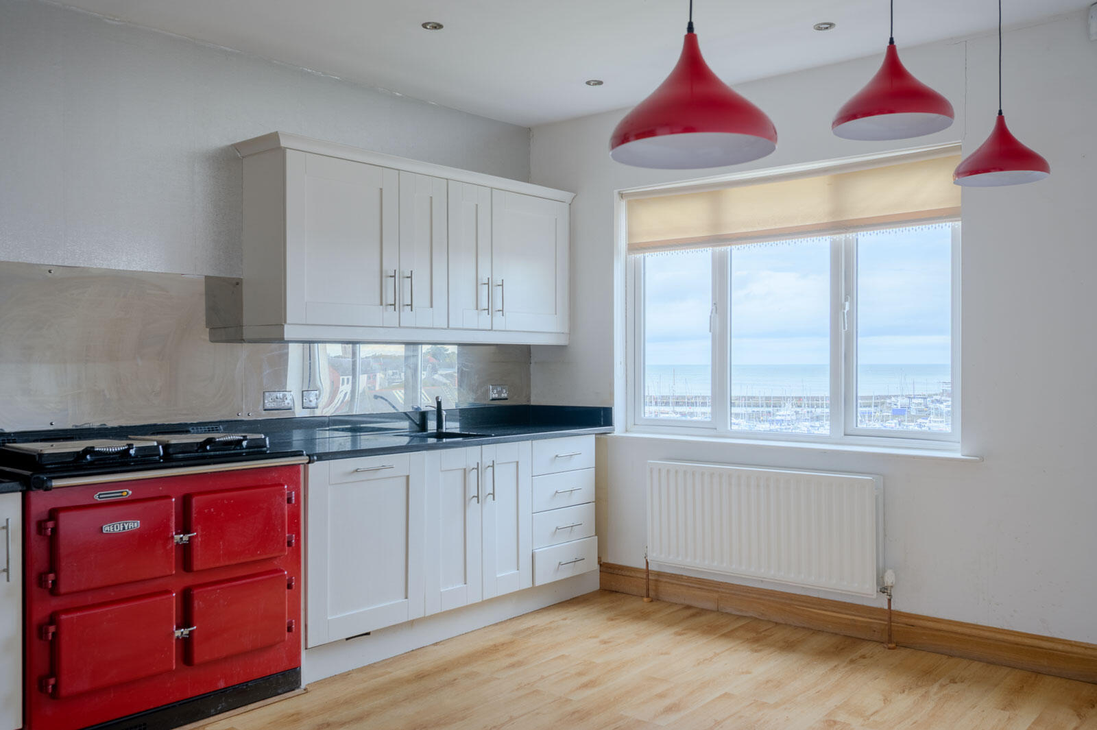 4.2 x 4.57 (13'9" x 14'11") - Bespoke fitted kitchen in hand painted Shaker style units, stainless steel fittings, granite work surface and upstand with stainless steel splashback, integrated four ring stainless steel gas hob, oven below, stainless steel extractor hood above, Redfyre electric range cooker with two hot plates and electric ovens below, integrated dishwasher, inset stainless steel sink unit with chrome mixer taps, concealed down lighting, integrated fridge freezer and Butler’s pantry, oak laminate wooden flooring, ample dining or living space with breathtaking elevated views across Bangor and Queen’s Parade to Bangor Marina and Harbour to Bangor and Ballyholme Bay, the Irish Sea and Scotland beyond.
