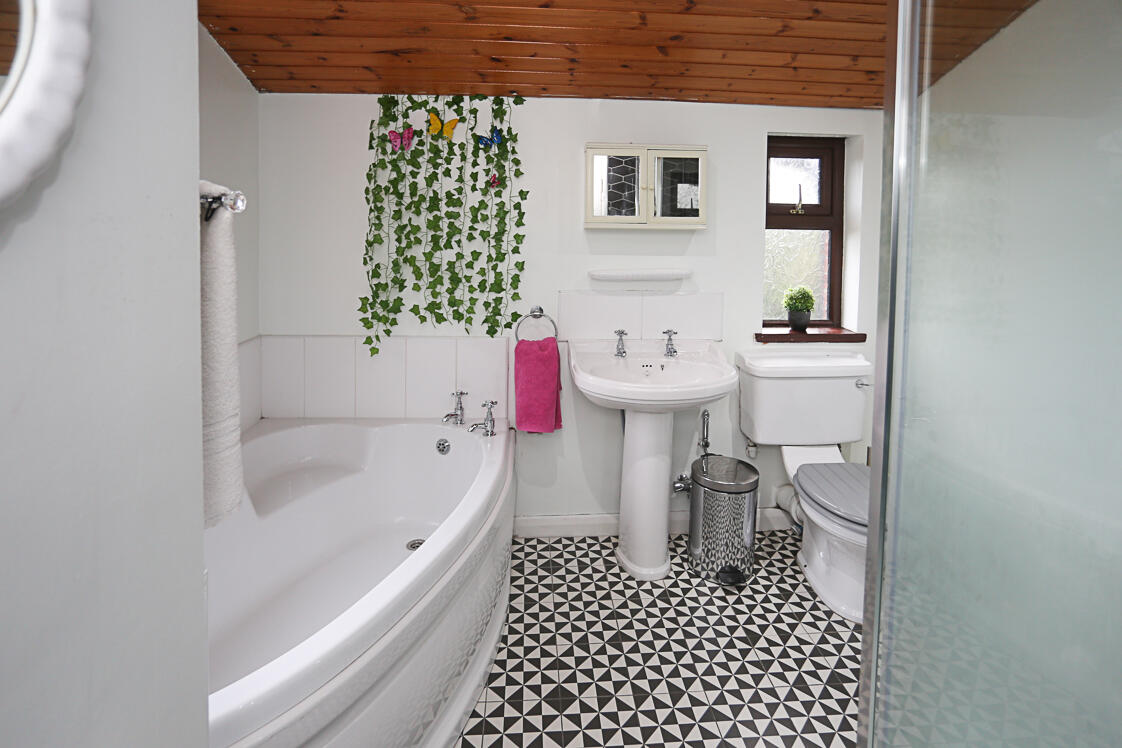 2.64m x 1.96m (8'8 x 6'5) - White suite comprising of low flush WC, pedestal wash hand basin with hot and cold taps, panelled bath with hot and cold taps, tiled splashback, walk-in thermostatically controlled shower, telephone handle attachment, drencher above with matt black fittings, sliding glazed shower screen, inset spotlight, partial uPVC tongue and groove ceiling, extractor fan, tiled floor.