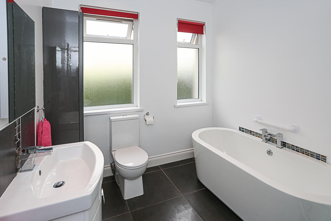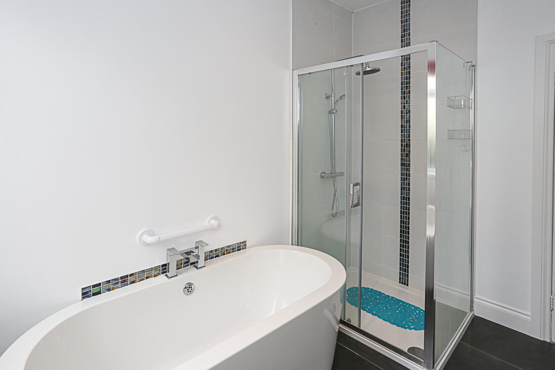 3.07m x 3.02m (10'1 x 9'11) - Contemporary white suite comprising low flush WC, wall hung wash hand basin, waterfall mixer tap, vanity storage below, tiled splashback, free standing bath with mixer tap, tiled splashback, walk-in thermostatically controlled shower, telephone handle attachment, drencher above, tiled splashback, glazed shower screen, chrome heated towel rail, inset spotlights, extractor fan.