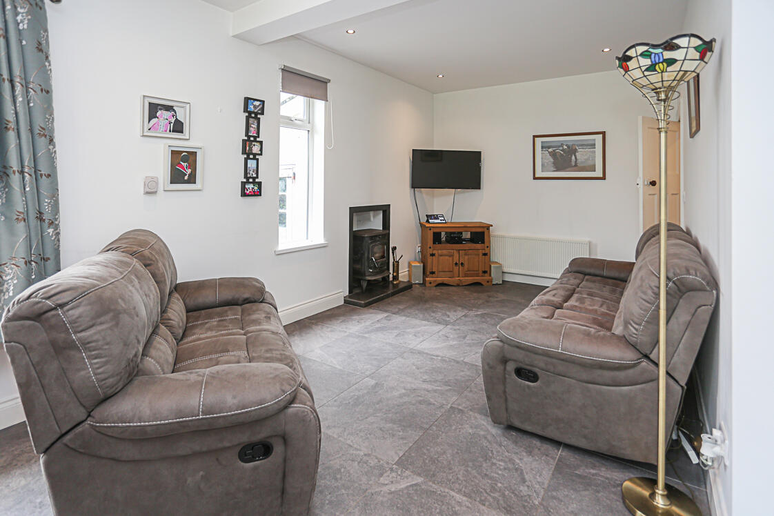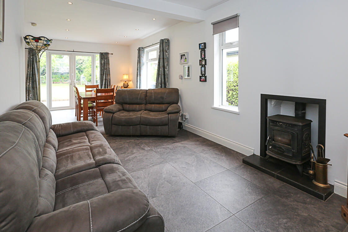 7.77m x 7.29m (25'6 x 23'11) - Living area with central wood burning stove, inset low voltage LED spotlights throughout, ample space for dining, fully fitted kitchen with range of high and low level units, space for fridge freezer, space for washing machine, space for range with glazed splashback, stainless steel sink and a half with drainer, chrome mixer tap, outlook to rear garden, integrated apartment sized dishwasher, uPVC and double glazed patio doors to rear garden, cloaks cupboard.