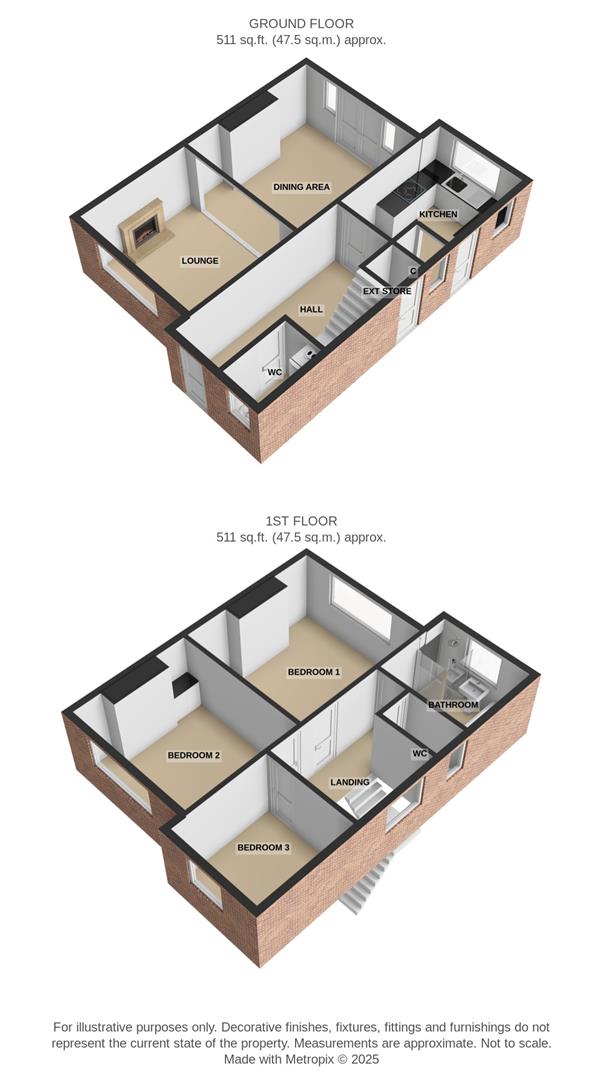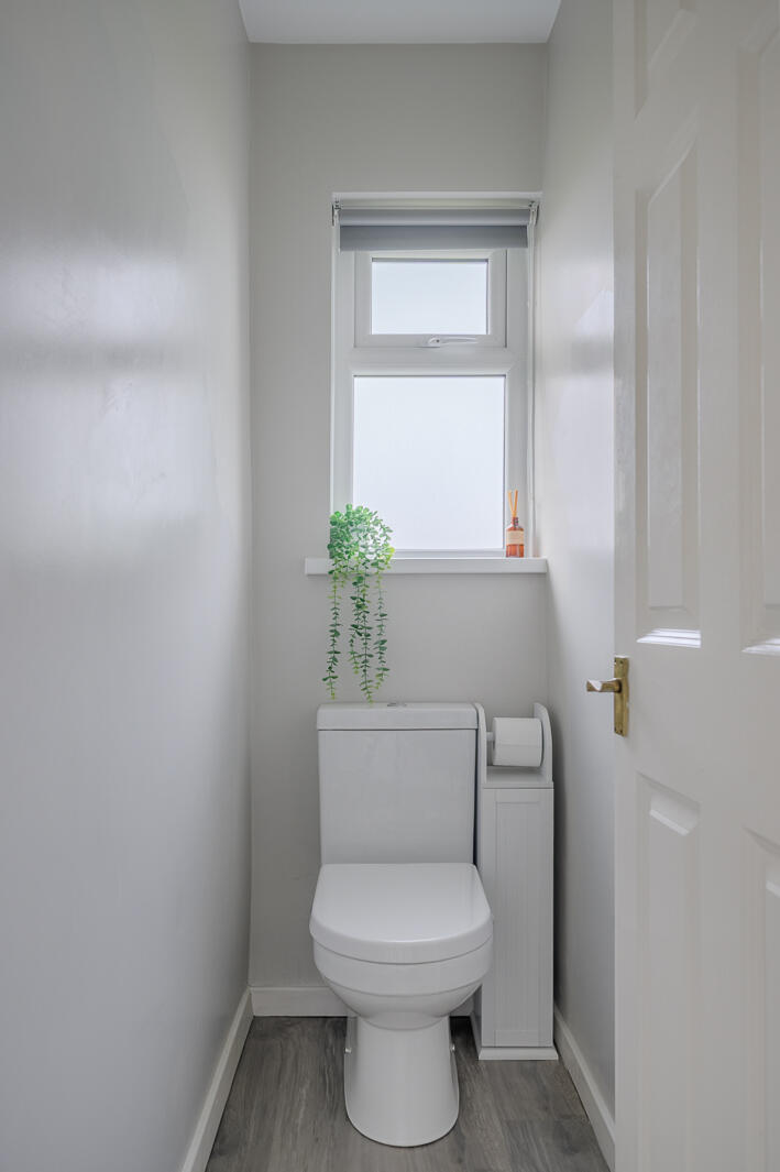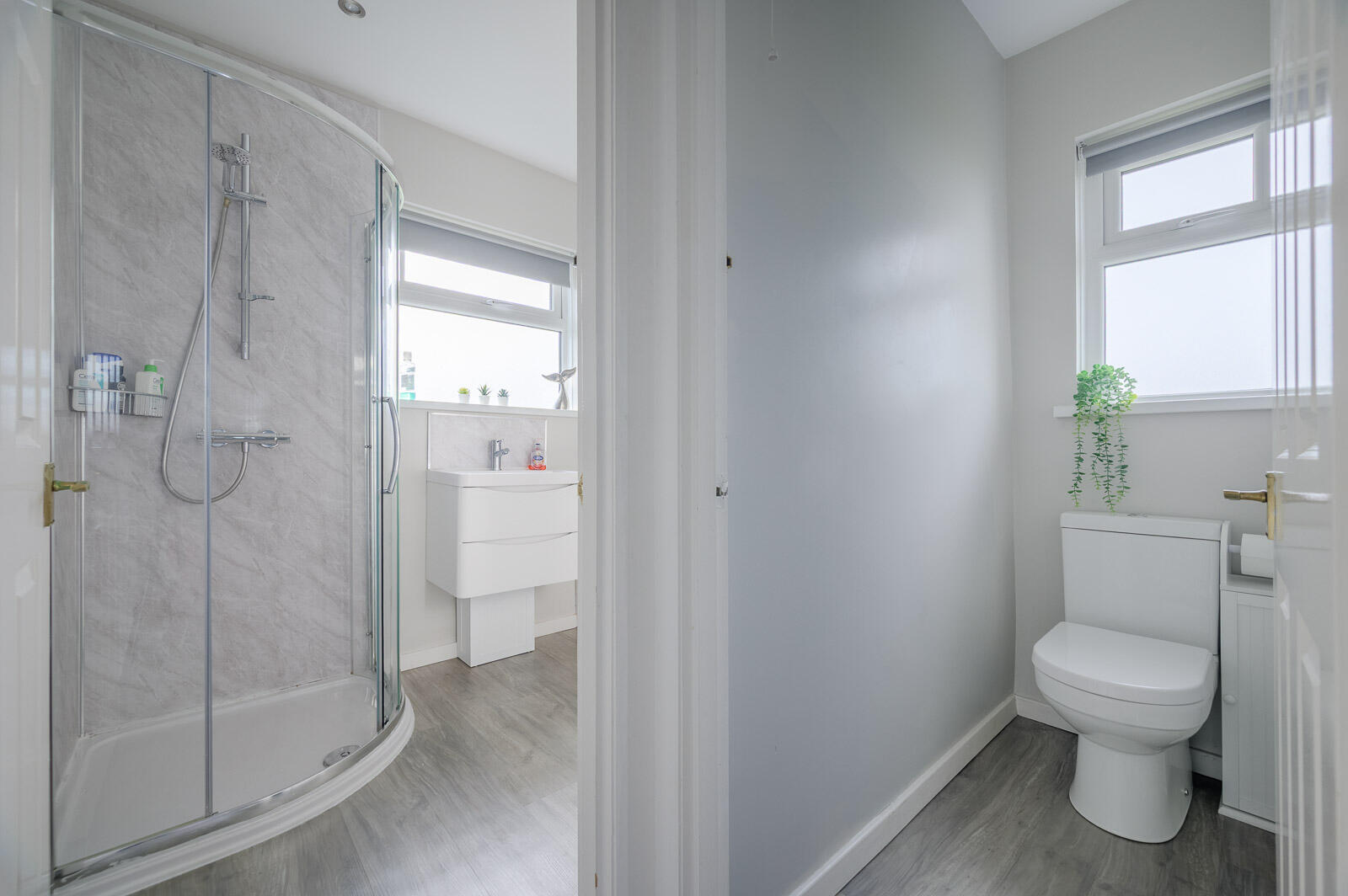 With low flush WC, pedestal wash hand basin, chrome mixer tap, uPVC panelled wall, Baxi gas fired boiler, electrics and fuse board.