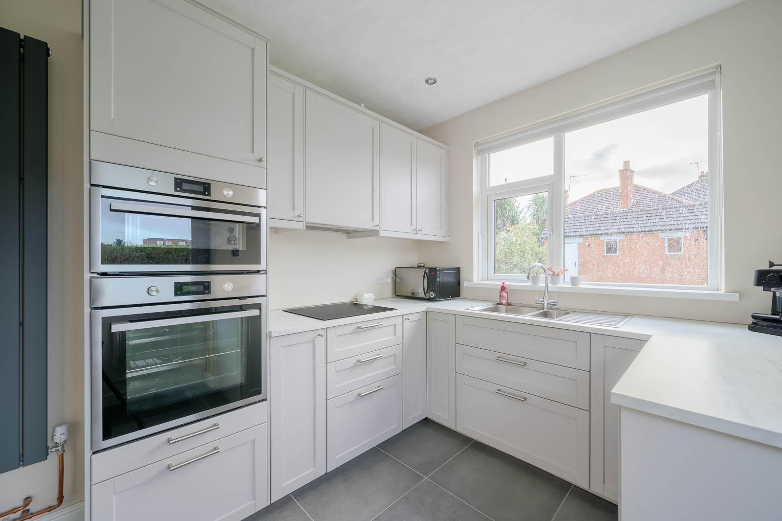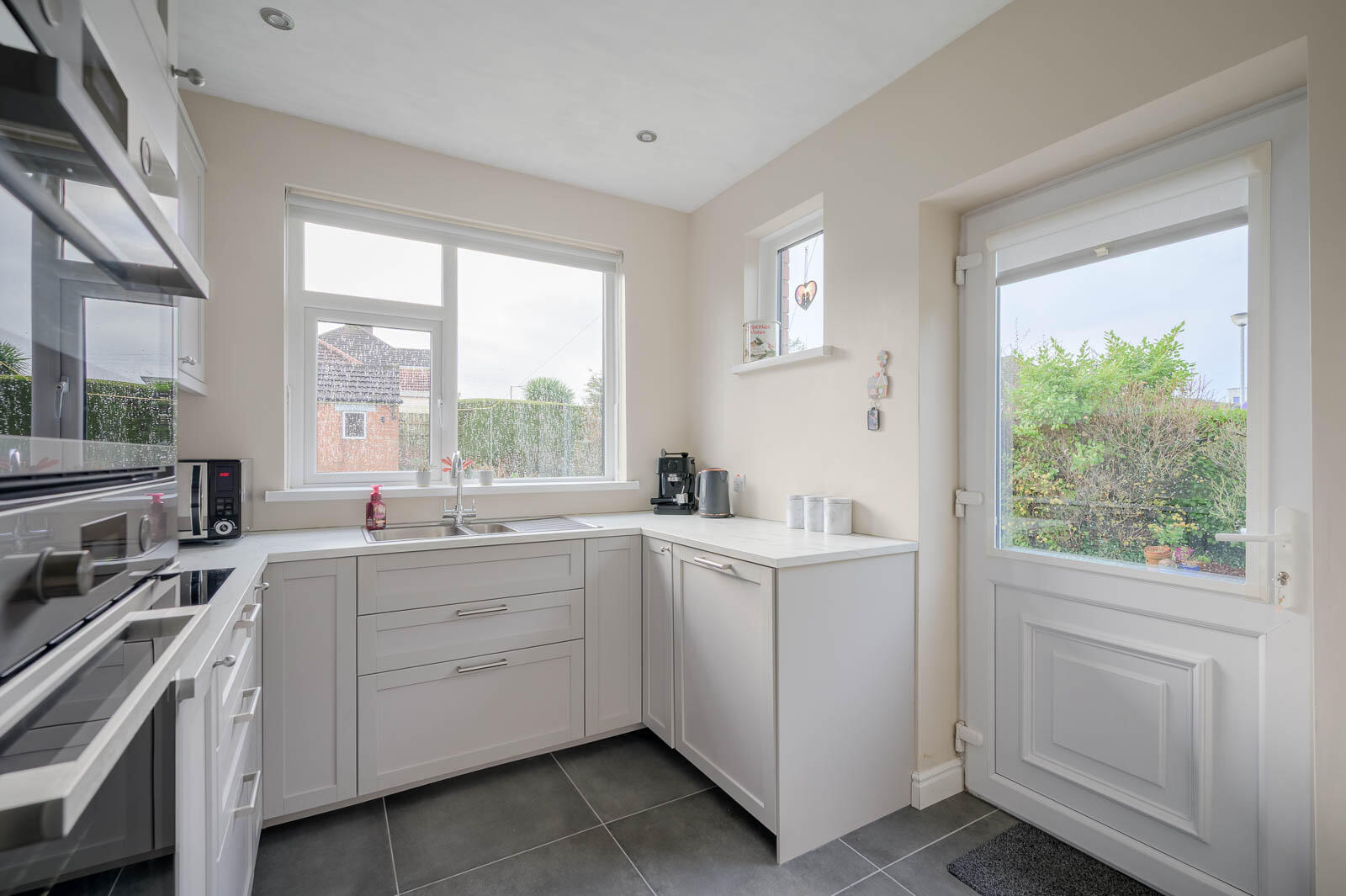 3.48m x 2.62m (11'5 x 8'7) - Range of high and low level units, integrated dual oven, four ring hob, laminate marble effect work surface, stainless steel sink and a half with chrome mixer taps, outlook to rear, integrated dishwasher, pantry cupboard, uPVC double glazed access door to side garden, space for fridge freezer, feature tiled floor.