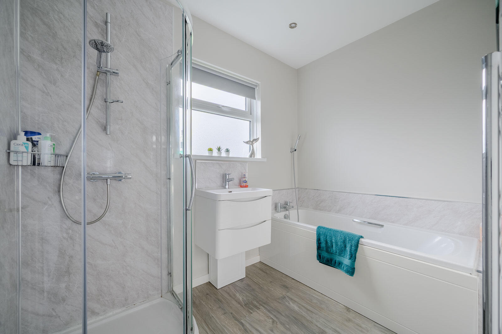 2.62m x 2.26m (8'7 x 7'5) - White suite comprising of wall hung wash hand basin, chrome mixer tap, vanity storage below, panelled bath with mixer taps, telephone handle attachment, walk-in thermostatically controlled shower, telephone handle attachment, uPVC panel, sliding glazed shower screen, laminate wood effect floor, chrome heated towel rail.