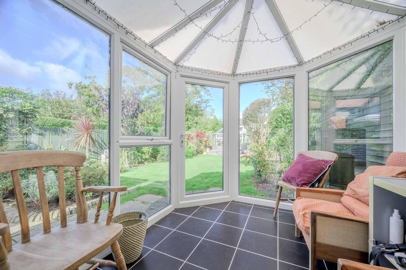 With low flush WC, pedestal wash hand basin, chrome mixer taps, partially panelled walls, extractor fan and sliding door with access door through to conservatory and access to rear garden.
