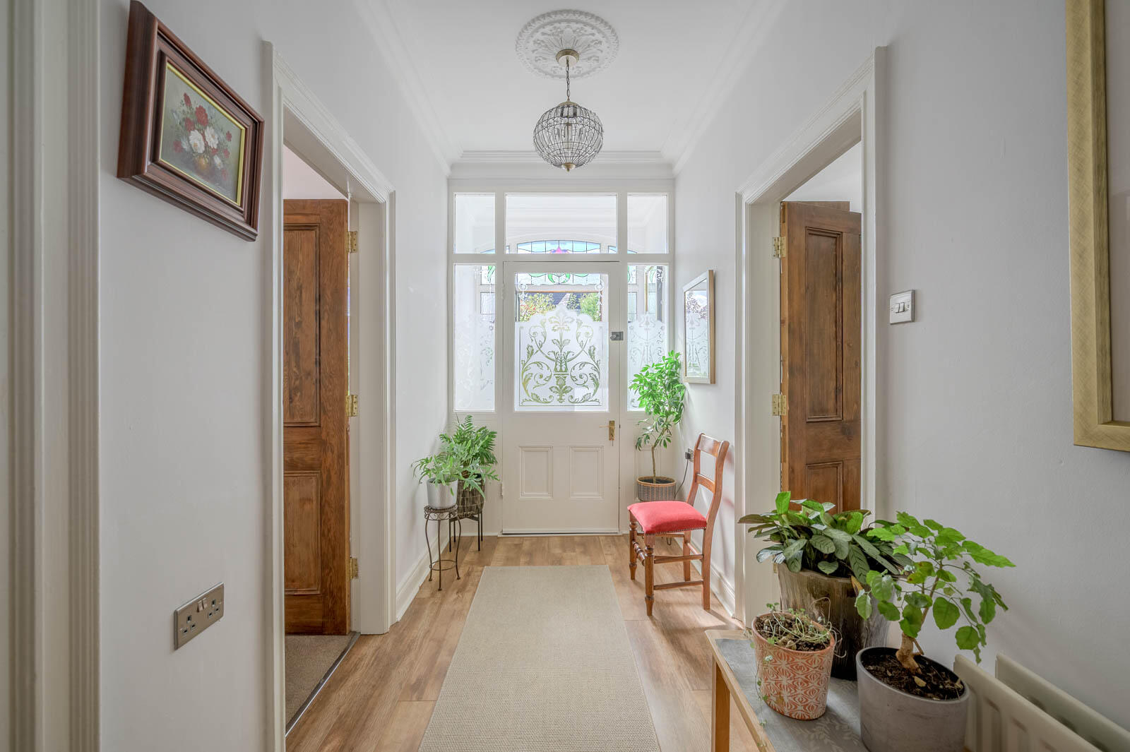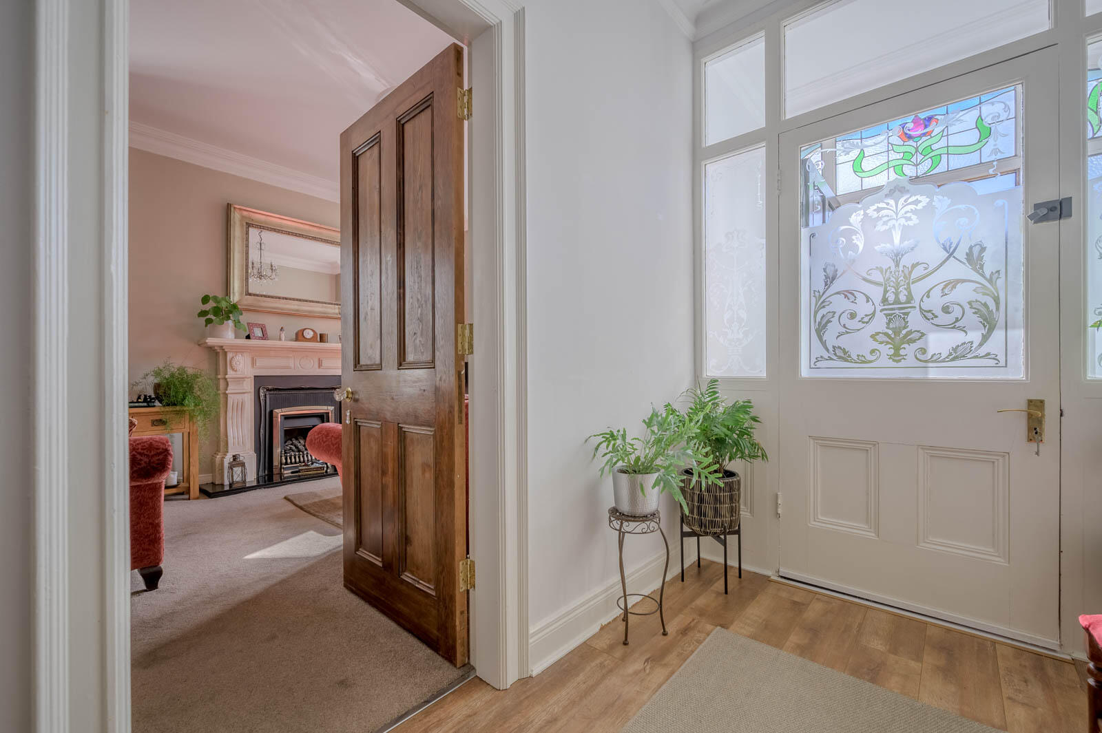 Hardwood front door and original stained and leaded top light and side lights through to reception porch.