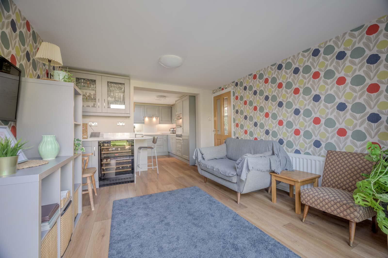 6.76m x 3.30m (22'2 x 10'10) - Kitchen with range of high and low level units, integrated fridge, integrated freezer, integrated dual oven, granite galaxy effect work surface, four ring hob with granite splashback, concealed extractor fan, integrated dishwasher, stainless steel sink and a half, chrome mixer taps, outlook to side, casual breakfast bar dining area, laminate wood effect floor, with uPVC and double glazed sliding patio door to rear garden, access through to garage and utility.