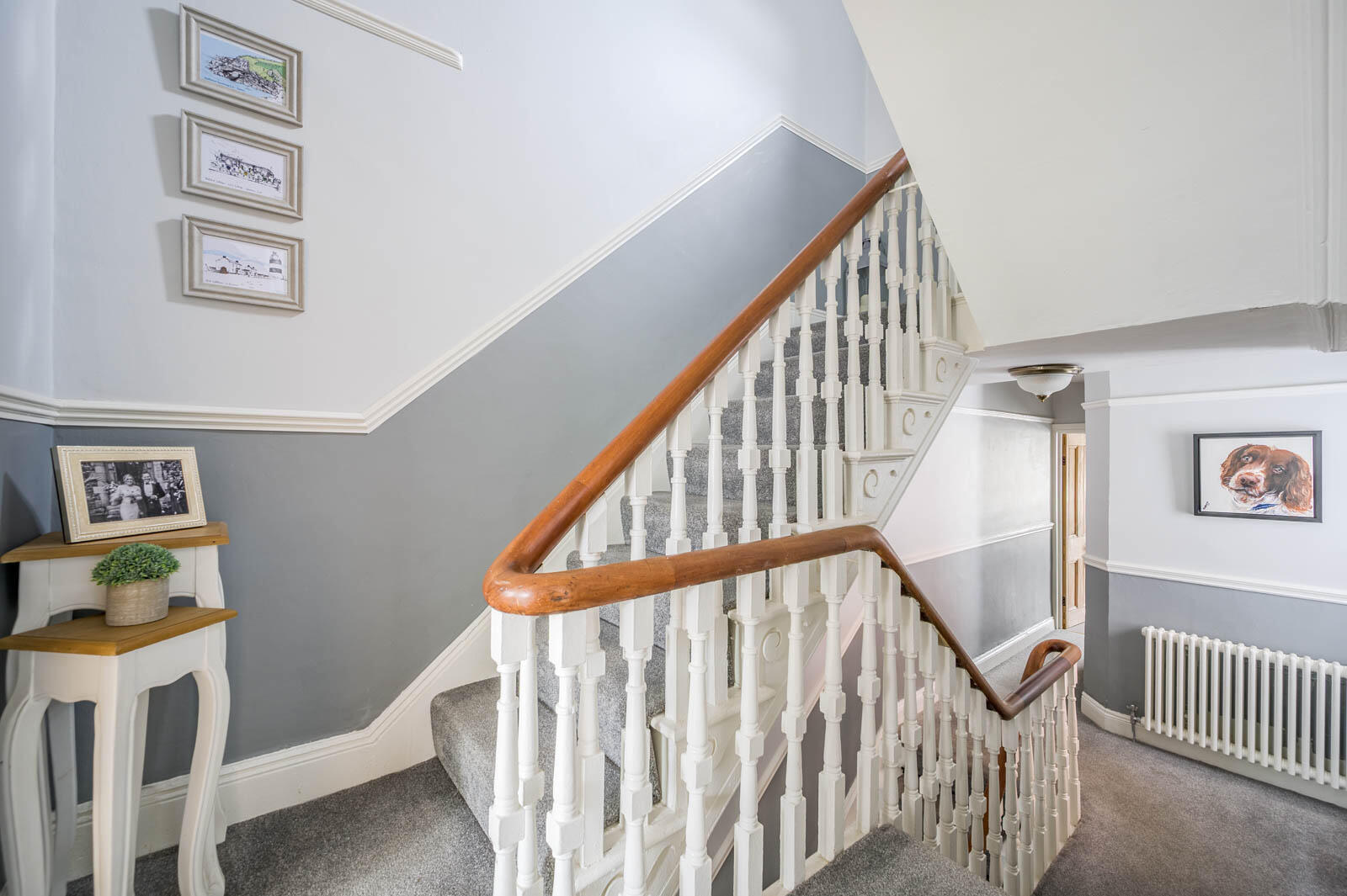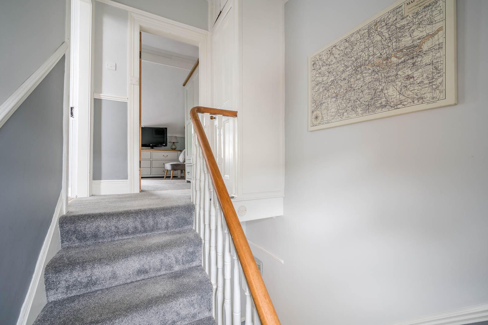 Newel post and turned spindle staircase to first floor return with walk-in storage room/study.