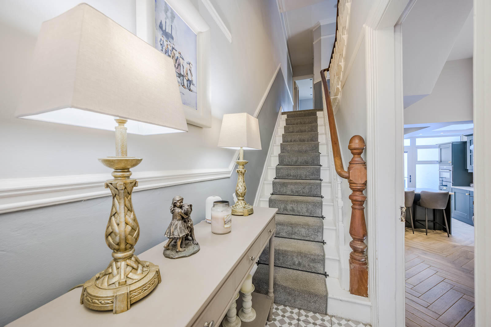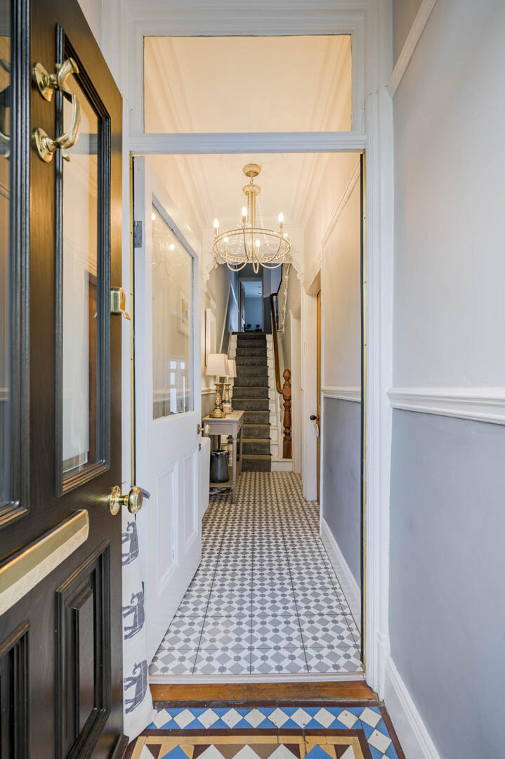 With cornice ceiling, picture rail and original Victorian tiled floor, glazed inner door and top light to reception hall.