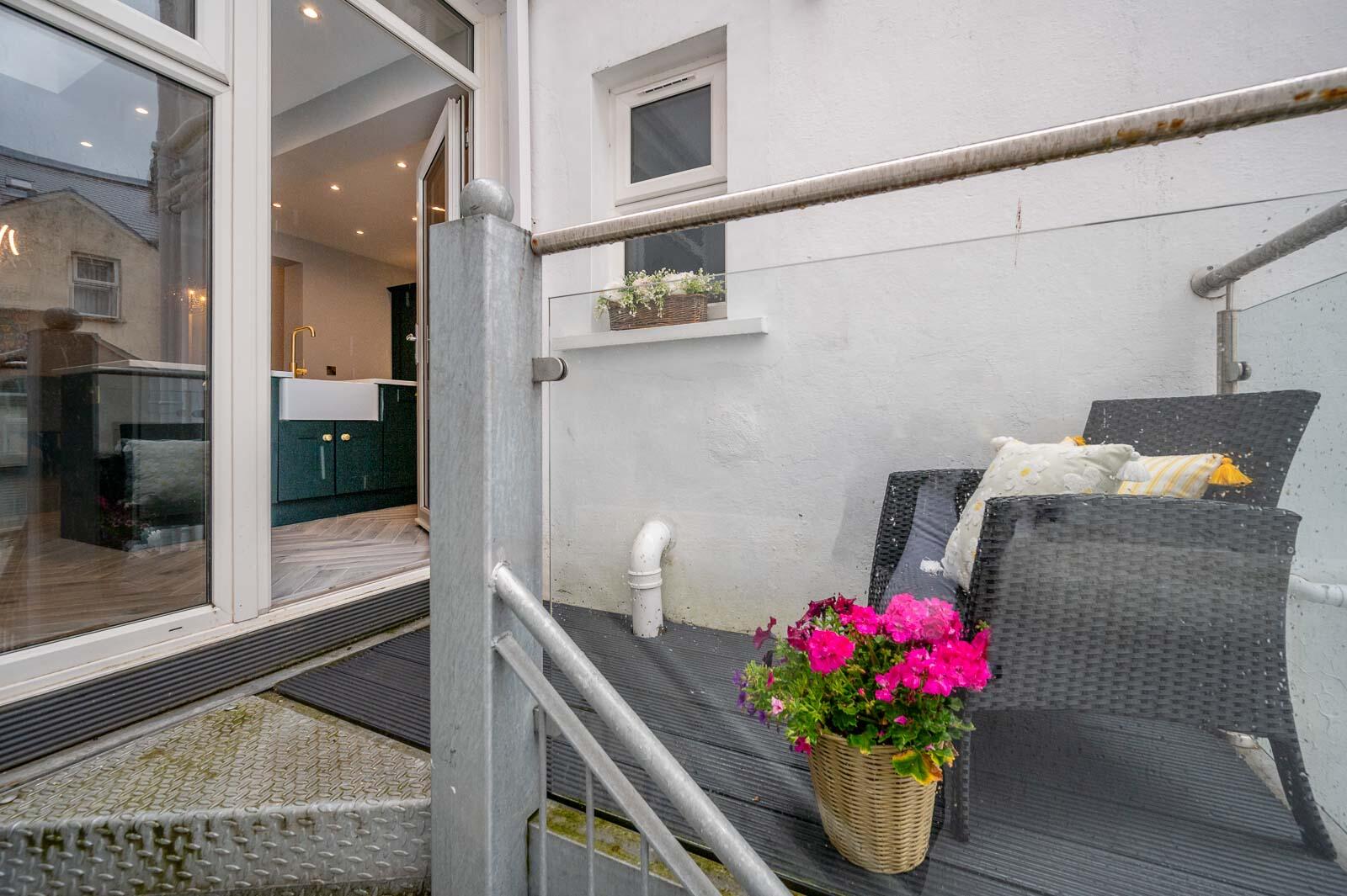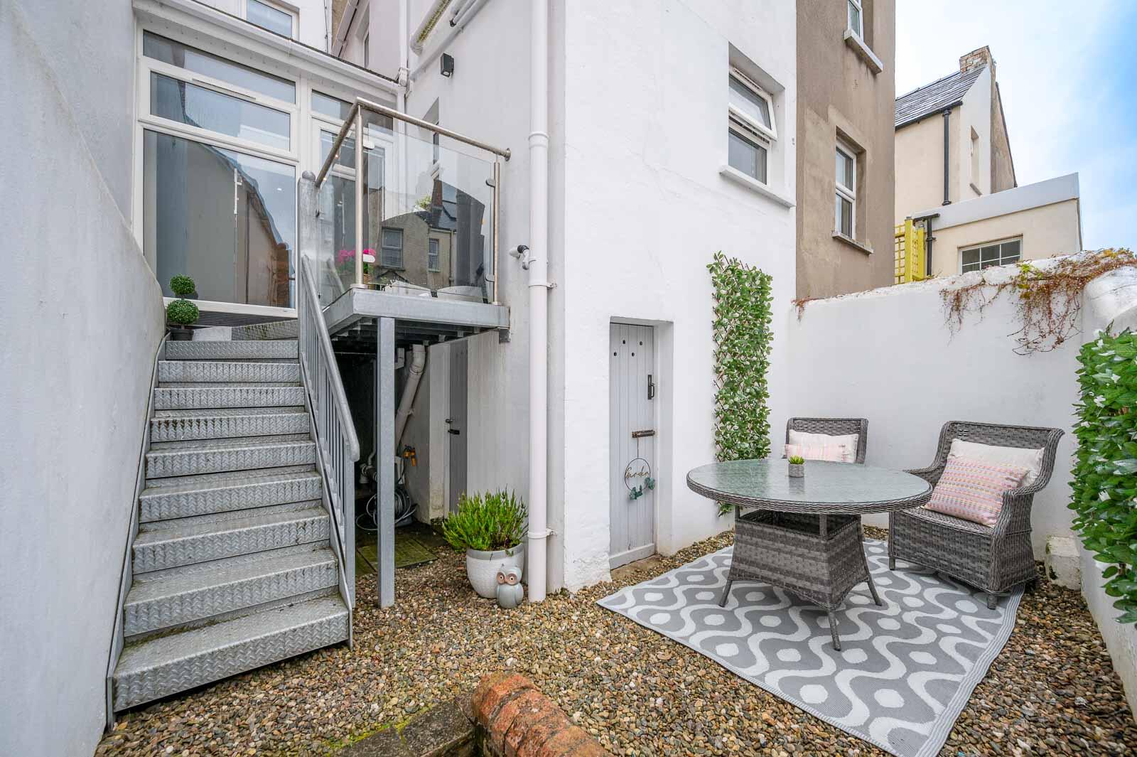 Quarry tiled wrought iron access gate and quarry tiled pathway to front door, loose pebbled front garden, loose pebbled rear garden and decked balcony terrace with light and water tap, stainless steel staircase from kitchen to rear loose pebbled rear garden.