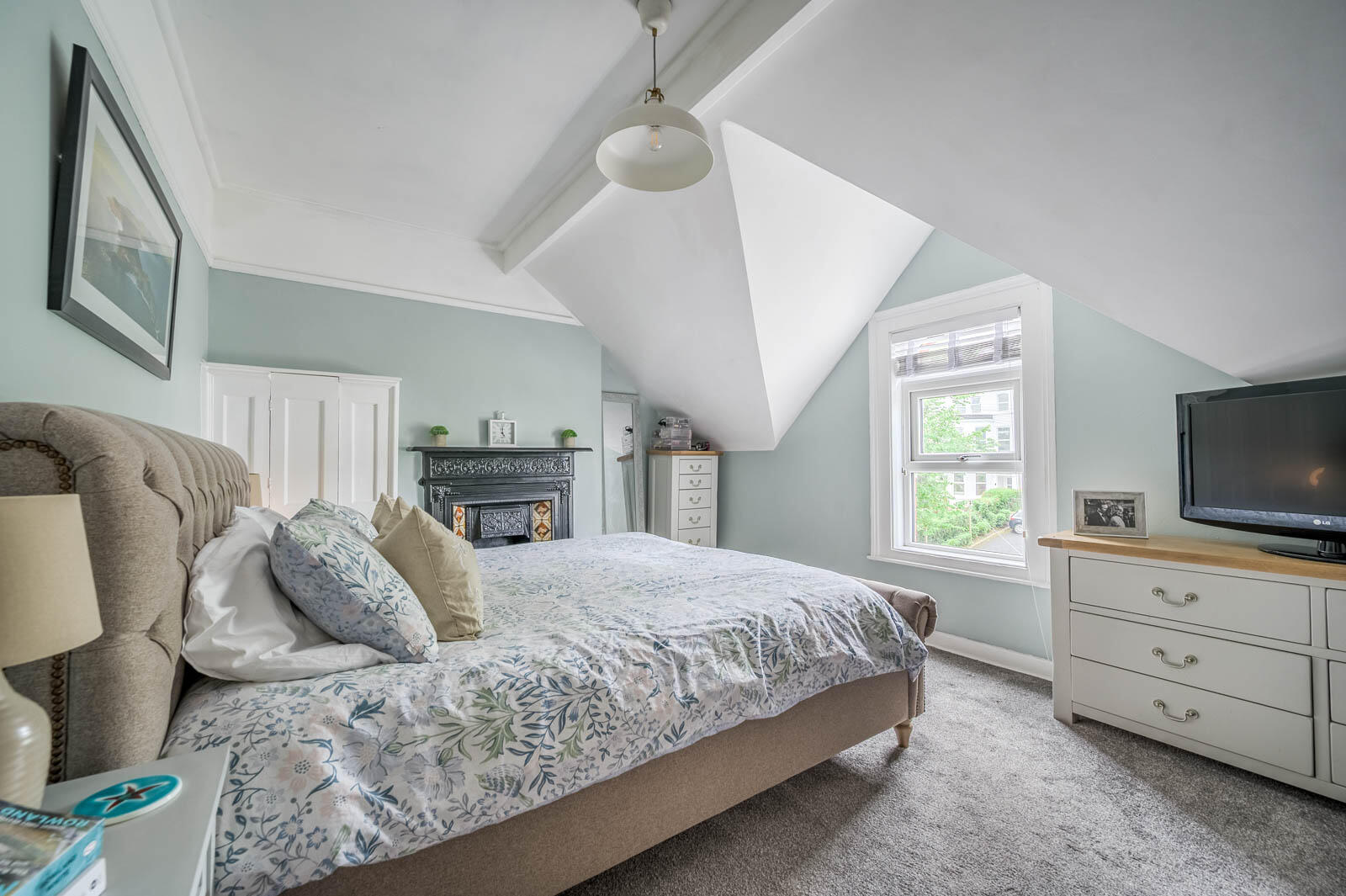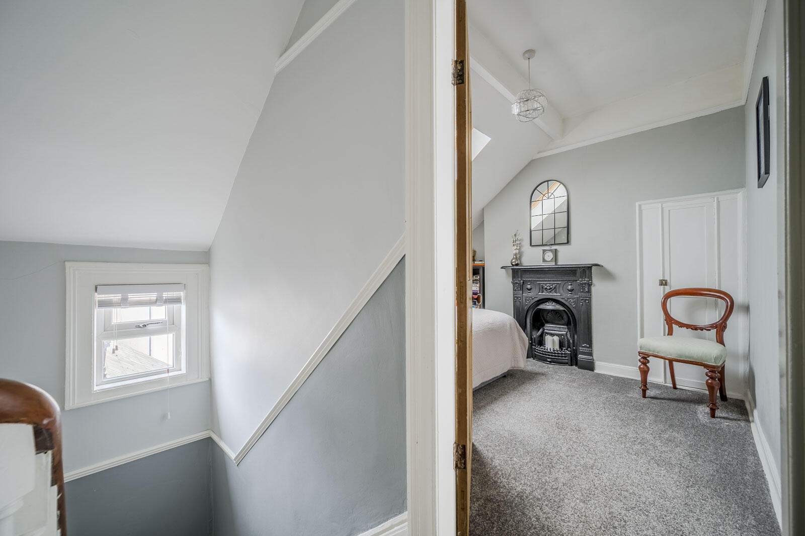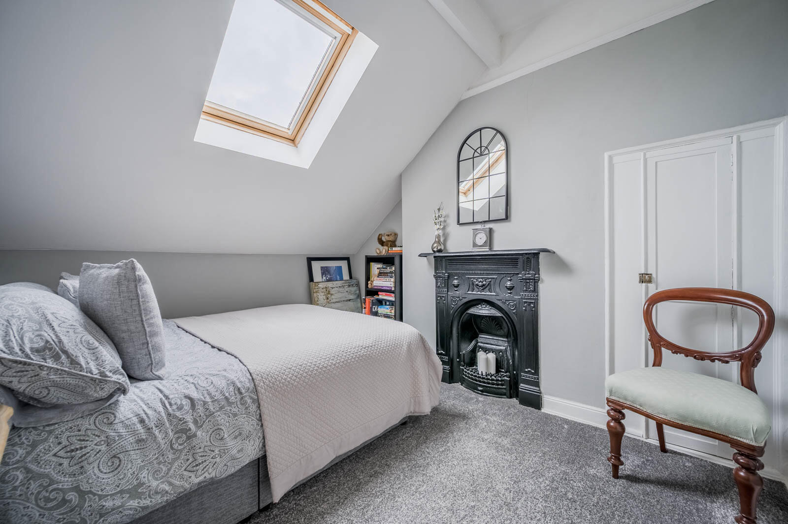 Cast iron period fireplace, Velux window, original small cupboard.