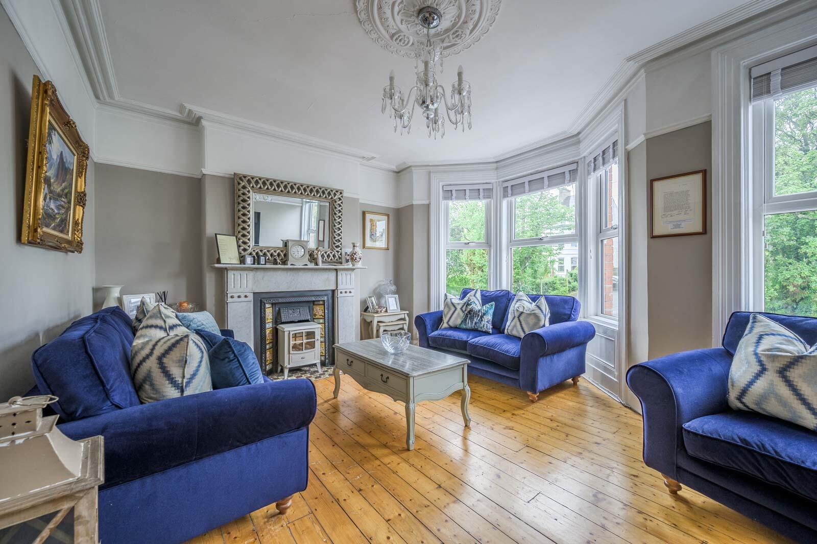 Exposed wooden flooring, measurement into bay window, white marble period fireplace with cast iron and tiled inset, tiled hearth, cornice ceiling, picture rail, ceiling rose, mature outlook to Princetown Road.