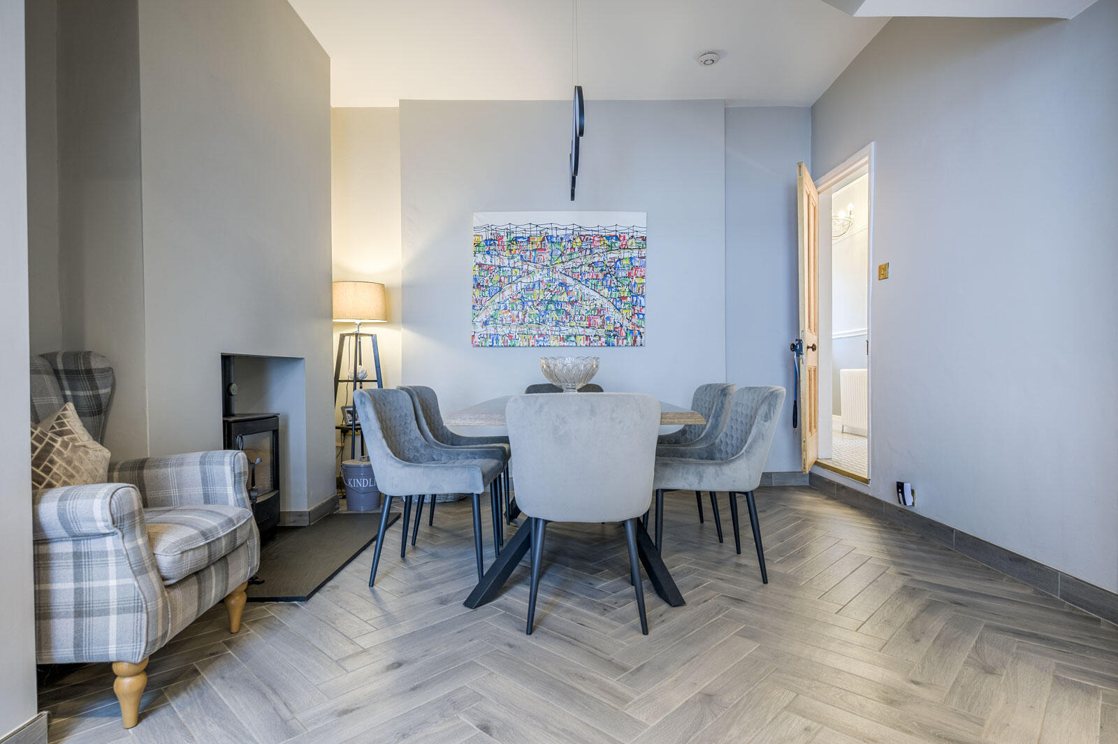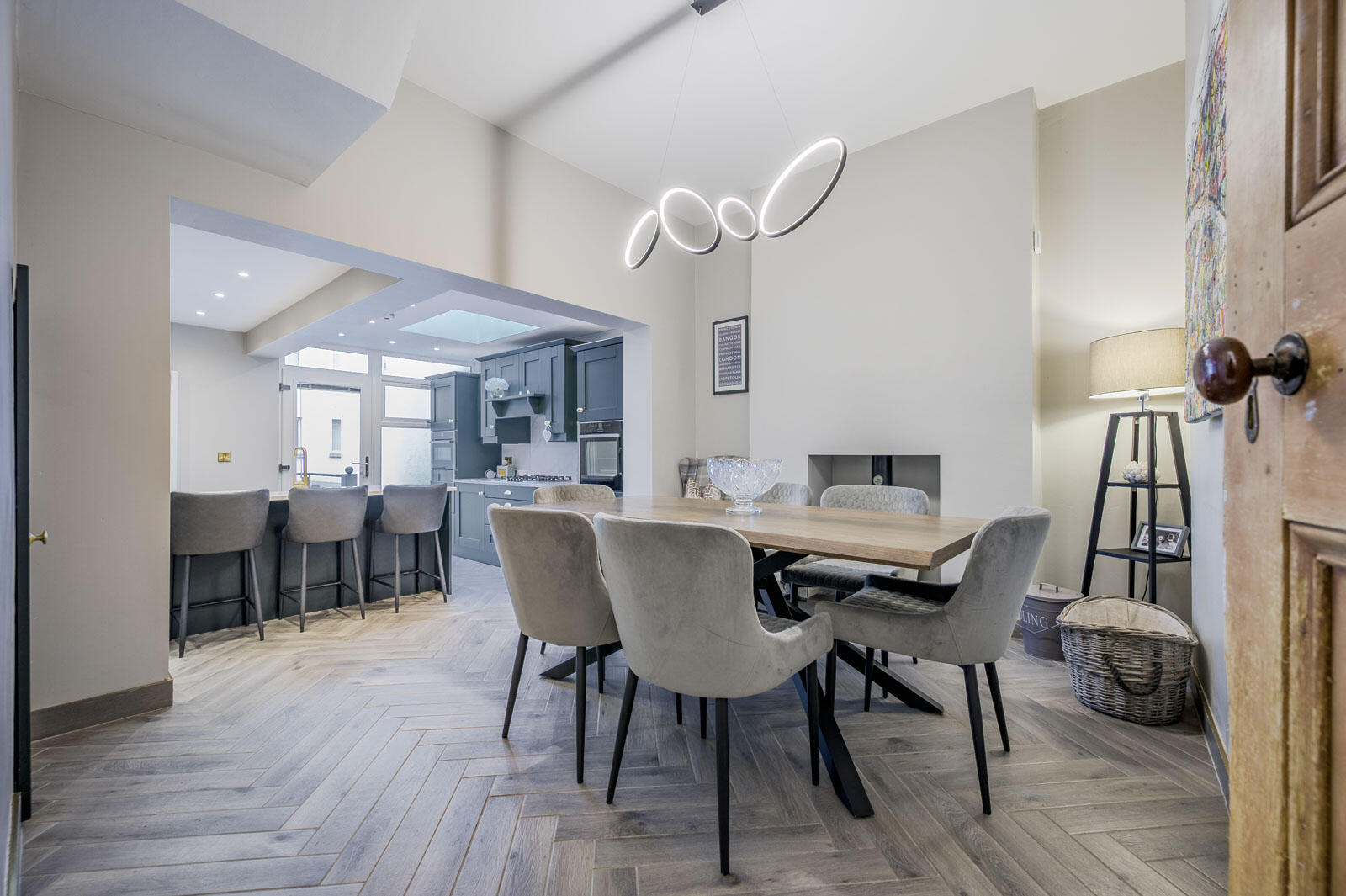 Porcelain chevron oak style tiled flooring throughout dining room and kitchen, dining room with hole in wall fireplace, cast iron wood burning stove on slate hearth, pantry/storage cupboard under stairs, hand painted Shaker style units with brass fittings, quartz work surface, upstand and splashback to stainless steel five ring integrated Neff burner gas hob, fixed canopy extractor hood, quartz splashback, integrated Neff high level double oven and high level combination microwave with warming drawer, quartz work surface, brushed brass mixer taps and ceramic inset sink unit, integrated Bosch dishwasher, casual dining/breakfast bar to other side of island, integrated fridge freezer x two, coffee station, quartz work surface and upstand, built-in pantry cupboards and excellent storage, recessed spotlighting, skylight lantern, uPVC double glazed access door to balcony and rear garden area, glazed access door to utility room.