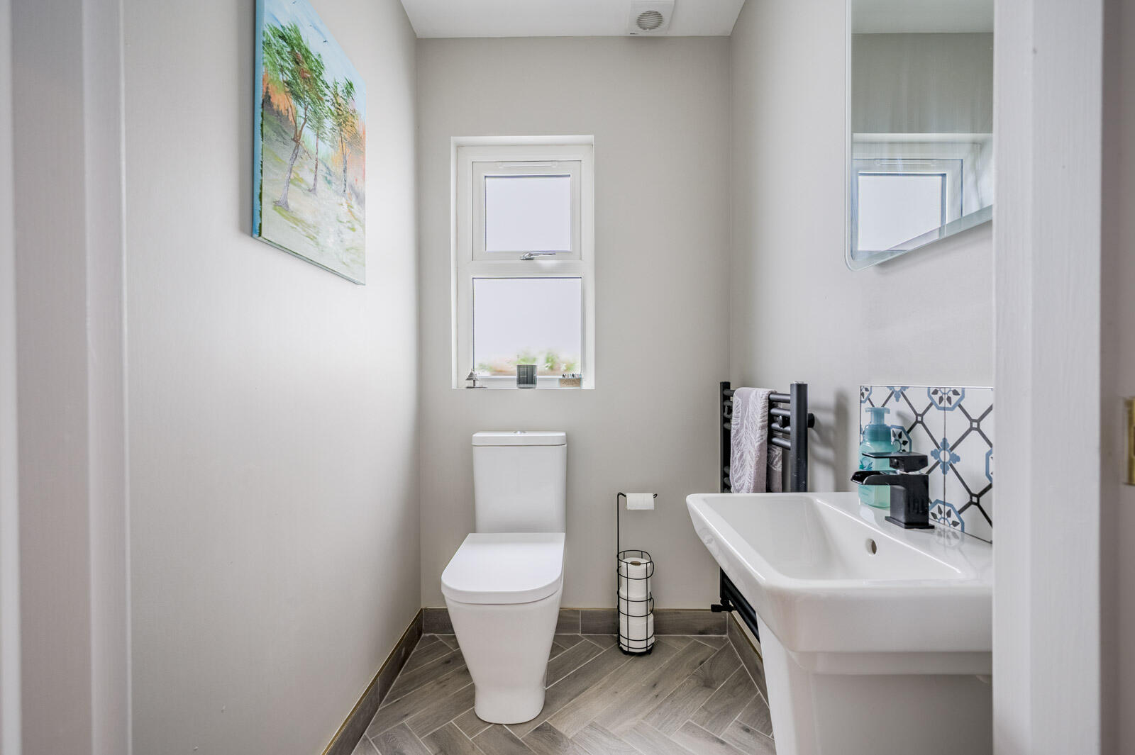 With contemporary white suite comprising low flush WC, floating wash hand basin, matt black mixer tap, tiled splashback, matt black heated towel rail, matching chevron porcelain oak style tiled floor, upstand, recessed LED spotlighting, extractor fan.
