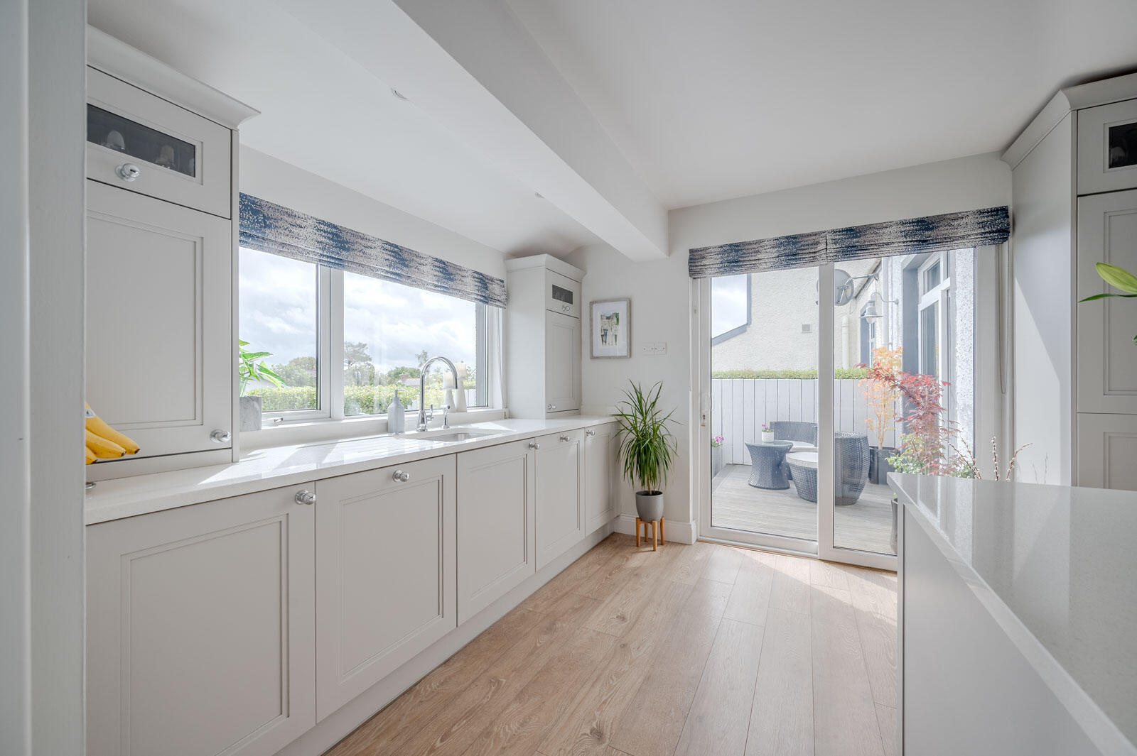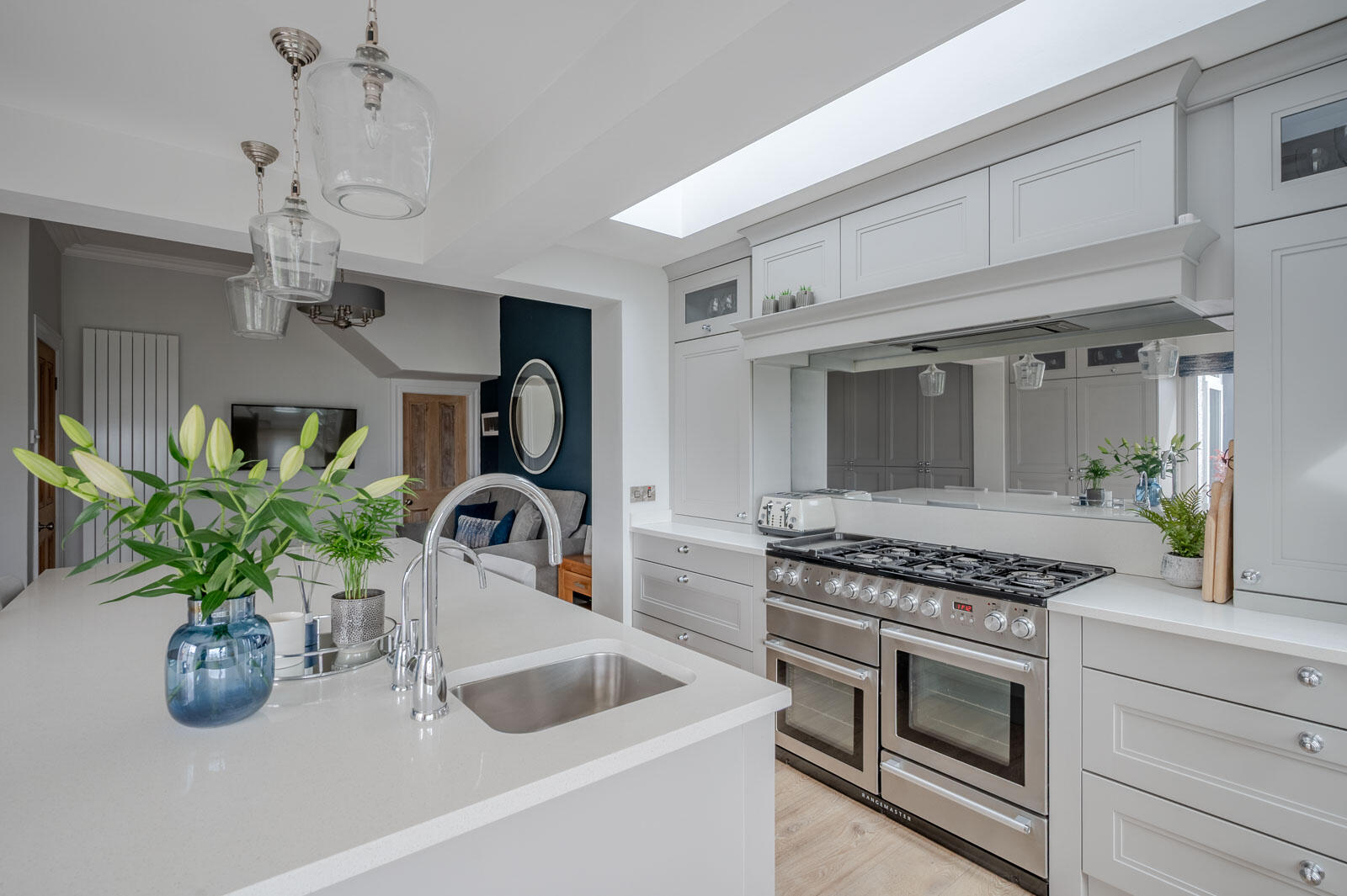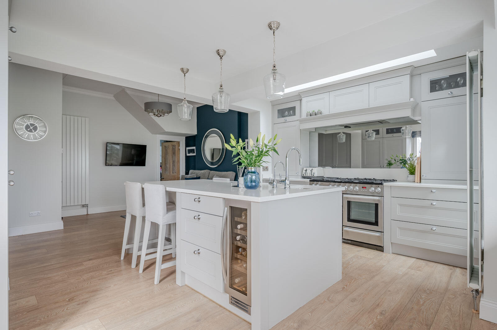 8.41m x 4.80m (27'7 x 15'9) - Storage under stairs, modern fully fitted bespoke kitchen with range of high and low level units, quartz work surface, 5-ring range with mirrored splashback, concealed extractor, glazed atrium, central island with casual breakfast bar dining, integrated wine fridge, stainless steel sink with boiling and filter tap, excellent storage. Outlook to rear, with stainless steel sink with InSinkErator and mixer taps, etched in drainer, integrated dishwasher, uPVC and double glazed sliding doors to garden, full length larder fridge, full length larder freezer and excellent built-in storage.