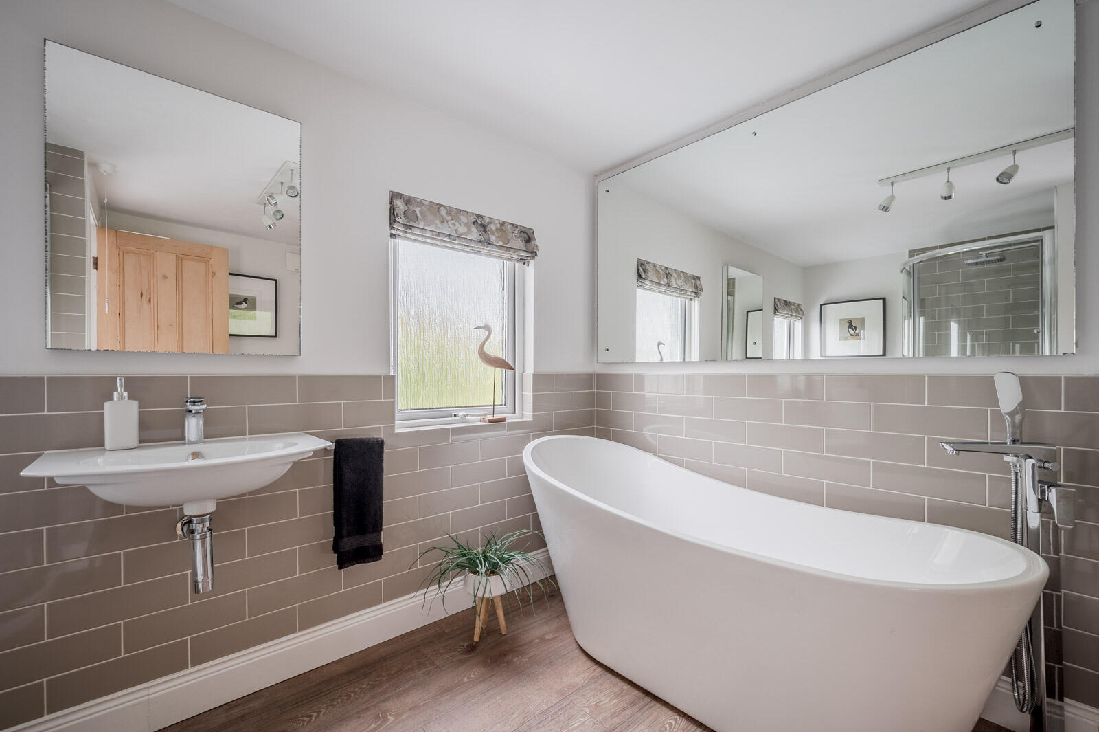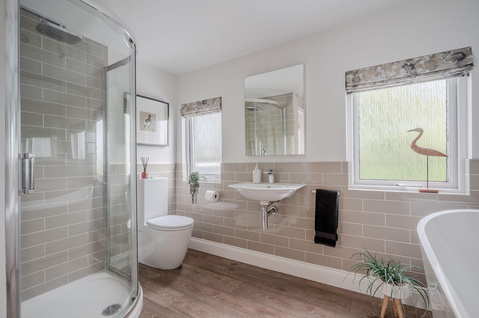3.18m x 3.00m (10'5 x 9'10) - White suite comprising of low flush WC, wall hung wash hand basin, chrome mixer tap, free standing contemporary bath with free standing mixer tap with telephone handle attachment, partial subway style tiled walls, thermostatically controlled shower, telephone handle attachment, drencher above, sliding glazed shower screen, laminate wood effect floor, extractor fan and hotpress cupboard with Worcester gas fired boiler.