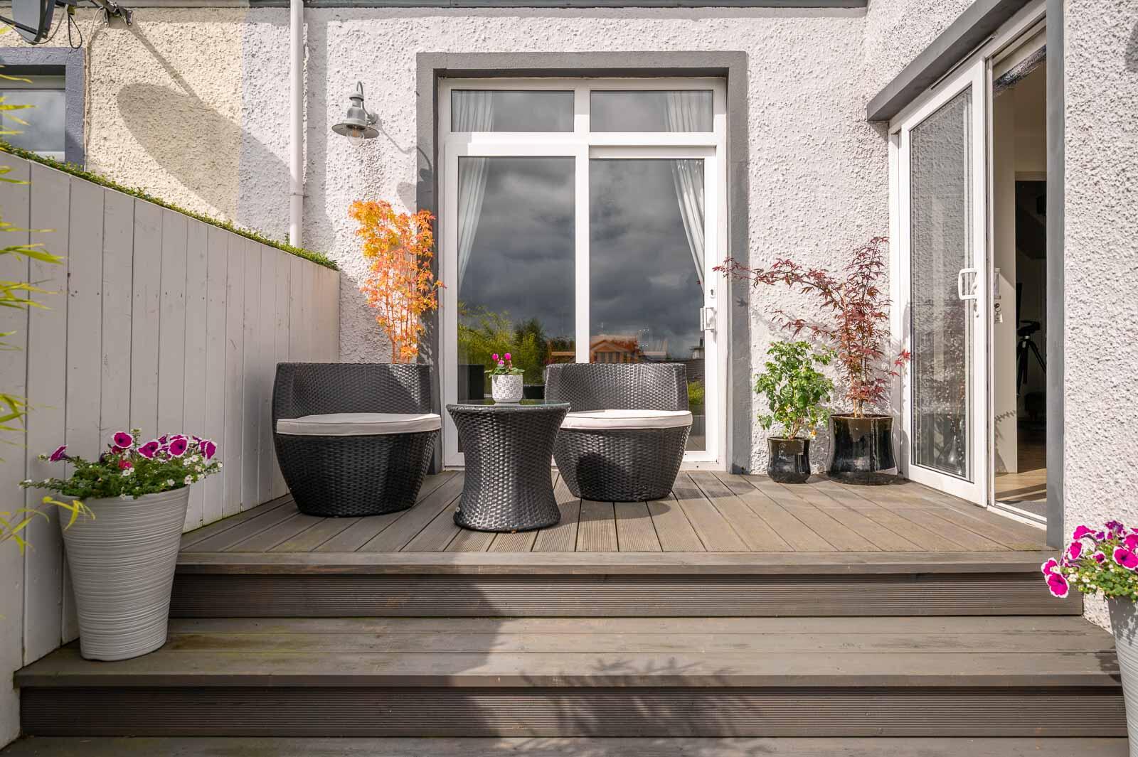 •Private rear garden with raised decking, mature planting and multiple seating areas