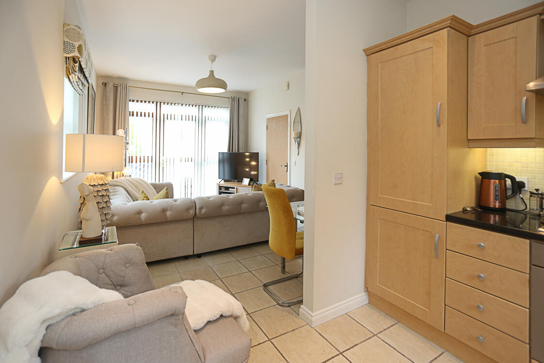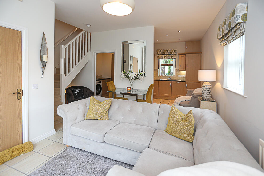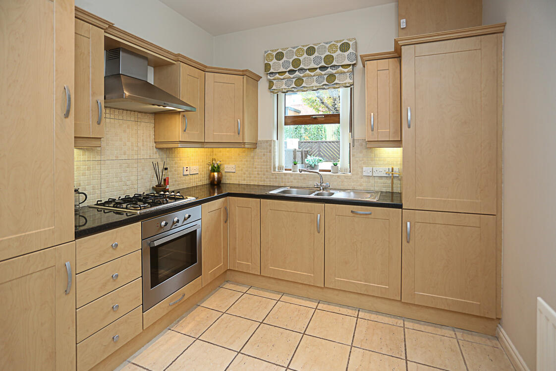 With ceramic tiled floor, dual aspect outlook with outlook to side and mature outlook to front, oak uPVC double glazed access door to front, lounge open through to kitchen. With excellent range of high and low level maple units with chrome fittings, granite effect work surface, single drainer sink and a half stainless steel sink unit, chrome mixer taps, integrated four ring stainless steel gas hob, stainless steel oven below and Neff stainless steel extractor hood above, integrated Neff dishwasher, concealed gas fired boiler, integrated fridge freezer, part tiled walls and mature outlook to rear gardens.