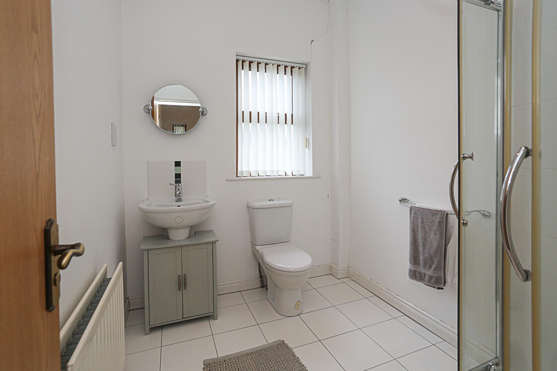 Modern white suite comprising low flush WC, pedestal wash hand basin, chrome mixer taps, tiled splashback, built-in fully tiled shower cubicle with inset tiling detail, built-in chrome thermostatically controlled shower unit, porcelain tiled floor, recessed spotlighting, extractor fan.