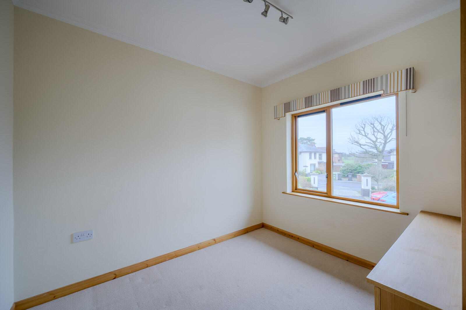 With laminate wood effect floor, inset low voltage LED spotlights, cornice bordering.