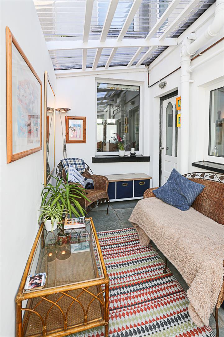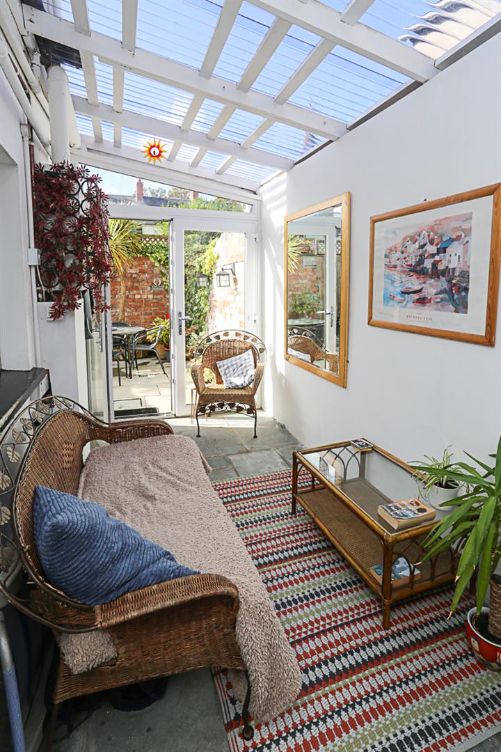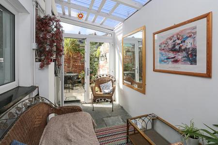 4.37m x 2.06m (14'4 x 6'9) - Stone paved floor, gas fired boiler, uPVC double glazed French doors to paved rear courtyard with planting and mature shrubs and bin access to rear, outside water tap.
