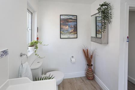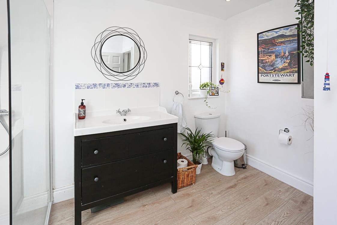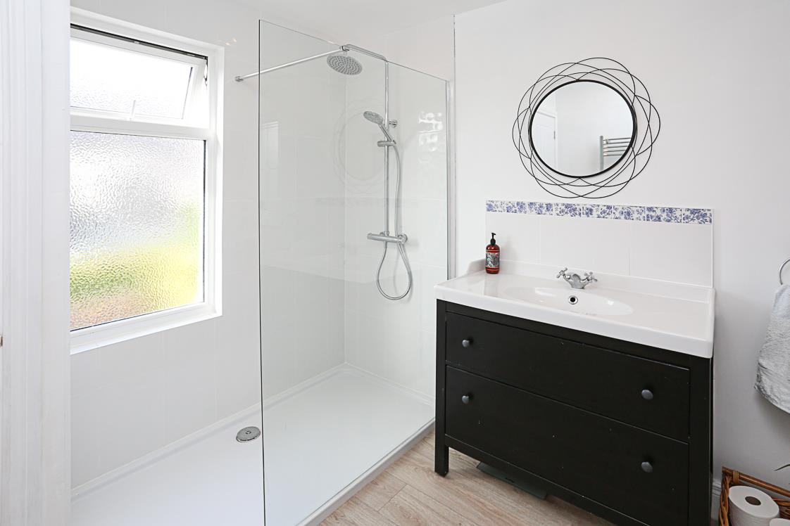 3.35m x 2.31m (11'0 x 7'7) - Modern white suite comprising: low flush WC, vanity unit, drawer units below, panelled bath, chrome mixer taps, tiled splashback, thermostatically controlled shower unit, glazed shower screen, plumbed for washing machine, leaded window to side, access hatch to roof void.