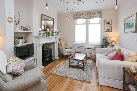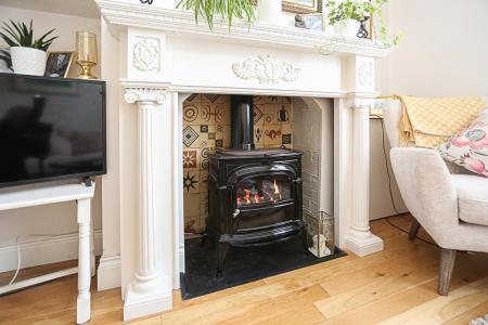 6.38m x 3.76m (20'11 x 12'4) - Oak wooden flooring, carved fireplace surround with cast iron gas stove with feature tiled recess, floating display shelving, outlook down to Ward Park, open to dining area with window through to covered yard/sun room.