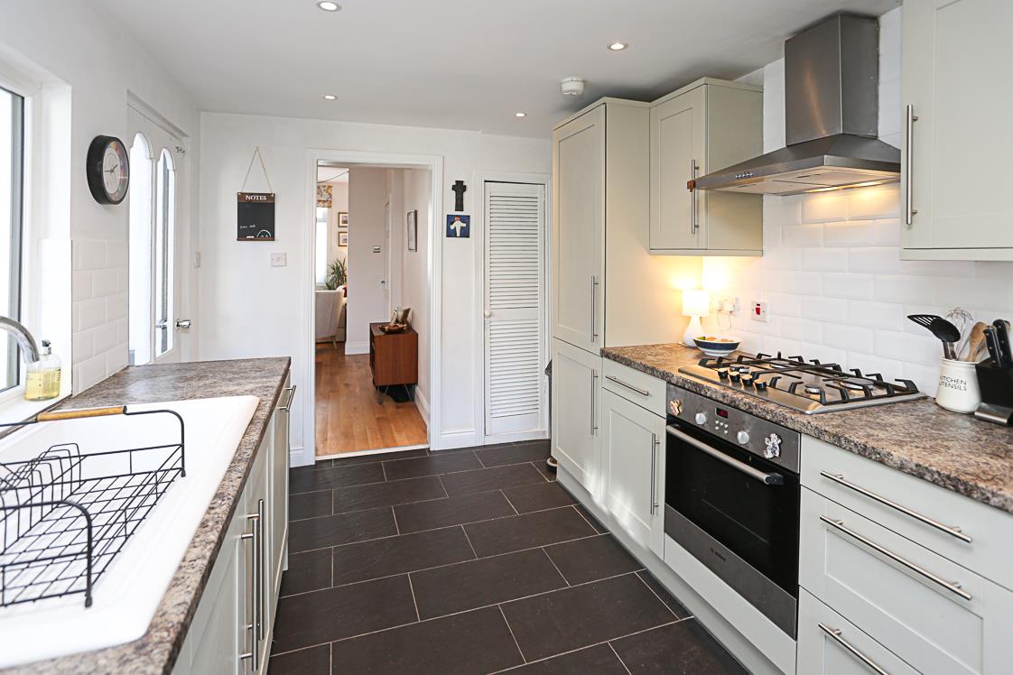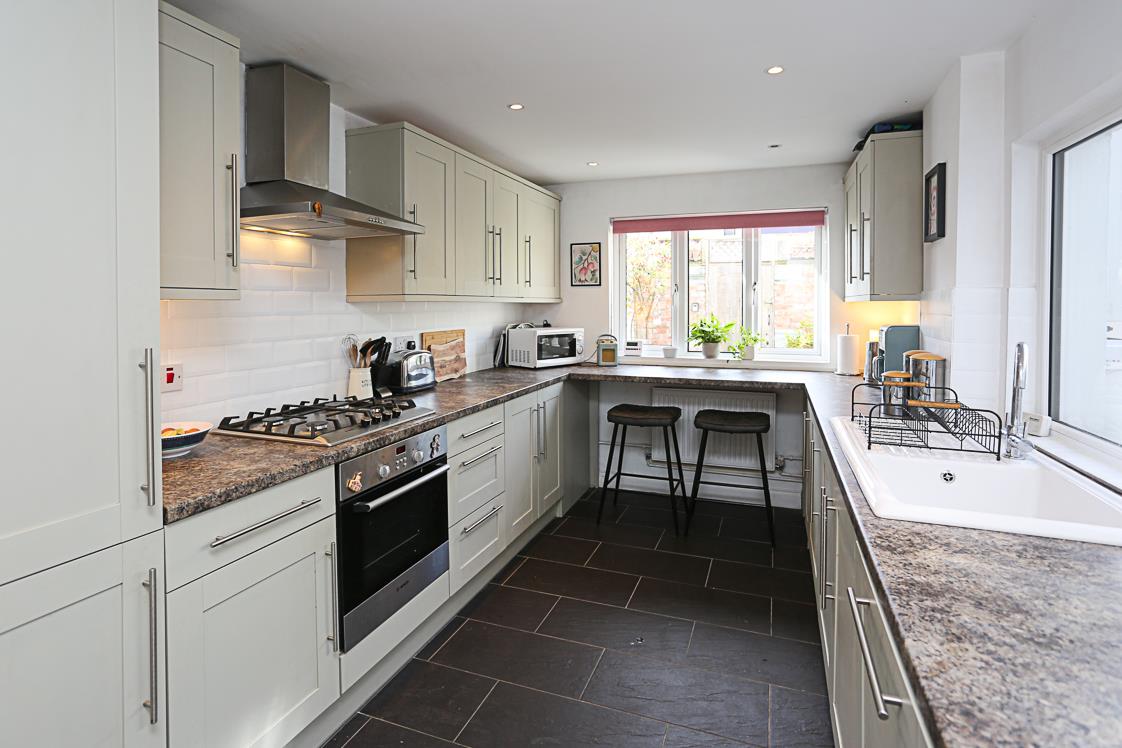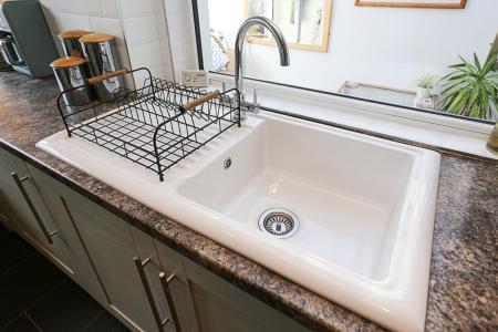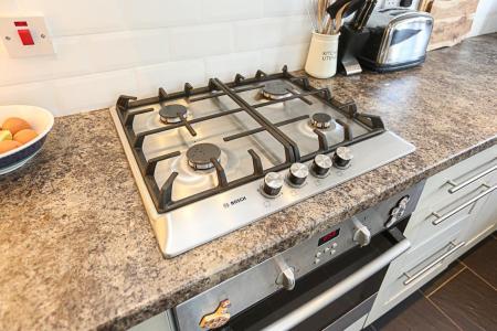 4.37m x 2.59m (14'4 x 8'6) - Excellent range of high and low level Shaker hand painted style units, stainless steel fittings, granite effect work surface, four ring stainless steel Bosch hob, stainless steel oven below, stainless steel extractor hood, subway part tiled walls, ceramic single drainer sink unit, integrated dishwasher, ceramic tiled floor, recessed spotlighting, fridge freezer, pantry cupboard and storage under stairs.