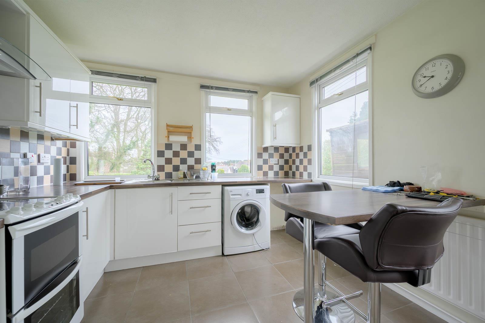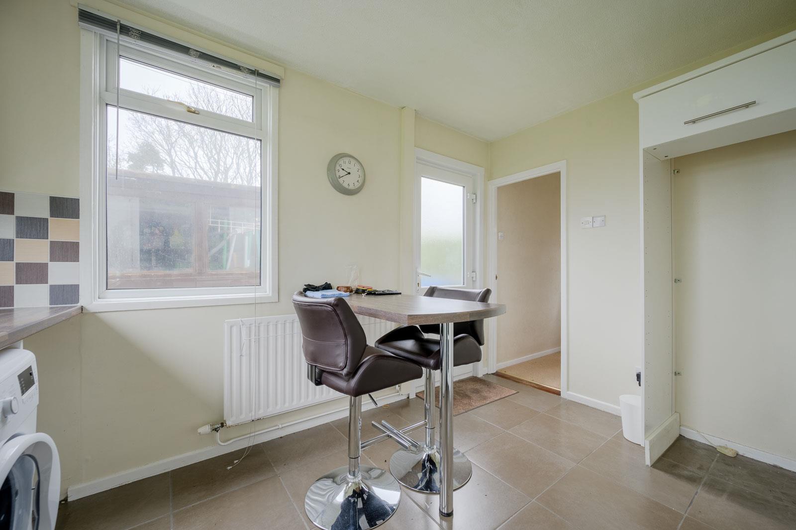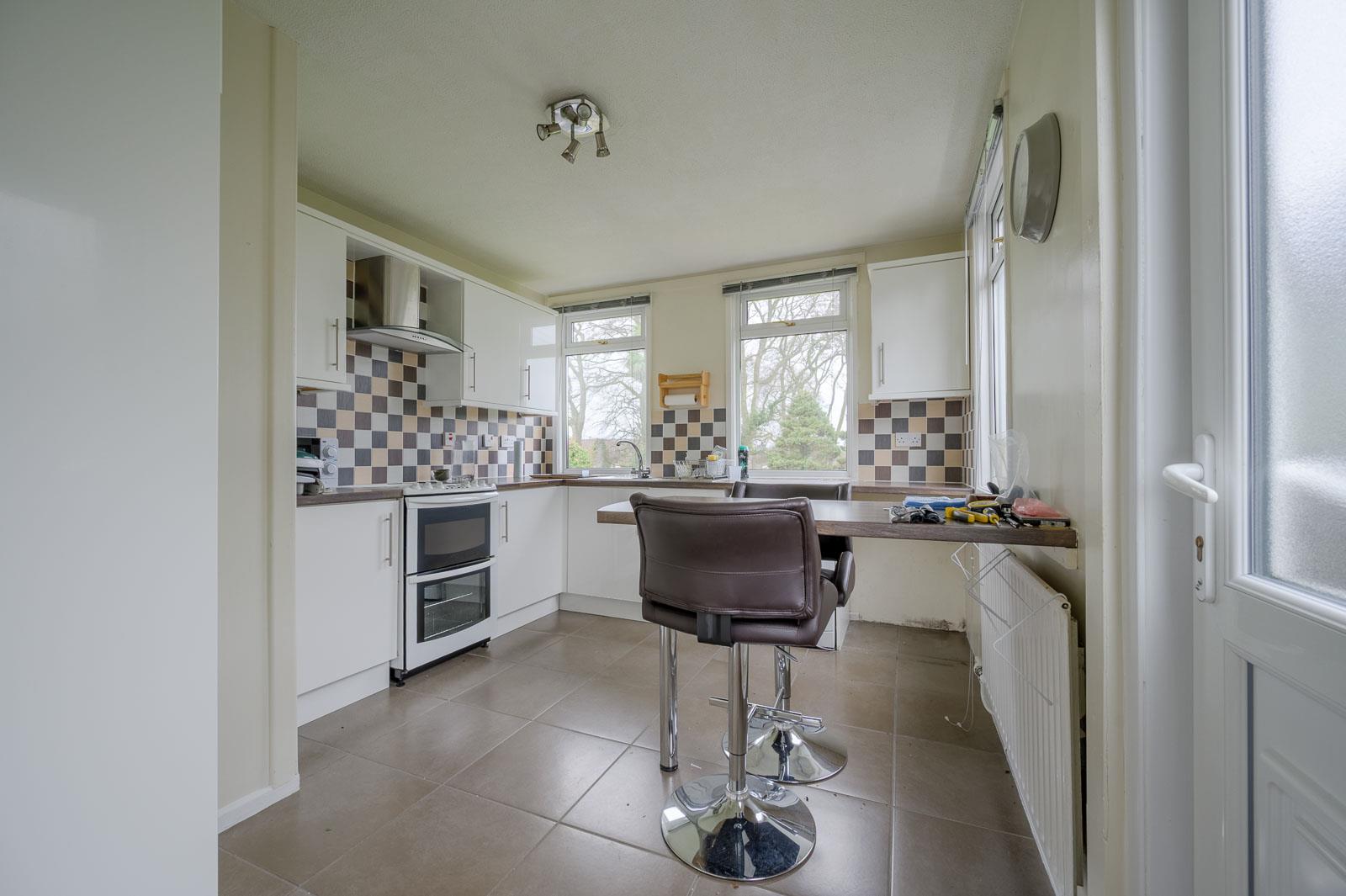 3.61m x 3.05m (11'10 x 10) - Range of high and low level high gloss units, laminate work surfaces, single bowl single drainer stainless steel sink unit, mixer tap, space for cooker range, tiled splashback, extractor fan above, plumbed for washing machine, recess for fridge freezer, breakfast bar, fully tiled floor, part tiled walls, fantastic aspect overlooking the rear garden, uPVC double glazed door to outside