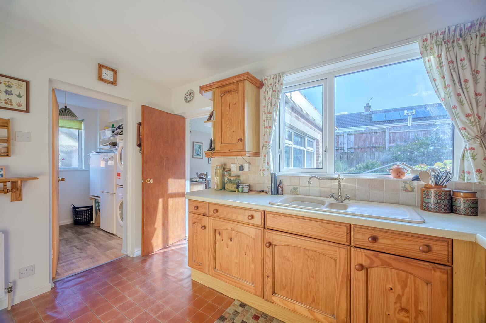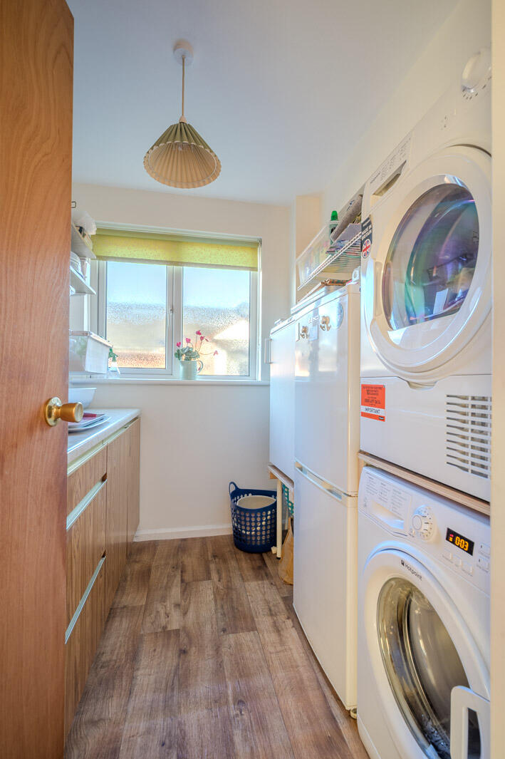 Built-in shelving, storage cupboards, laminate work surfaces, plumbed for washing machine, space for tumble dryer, space for fridge freezer or fridge.