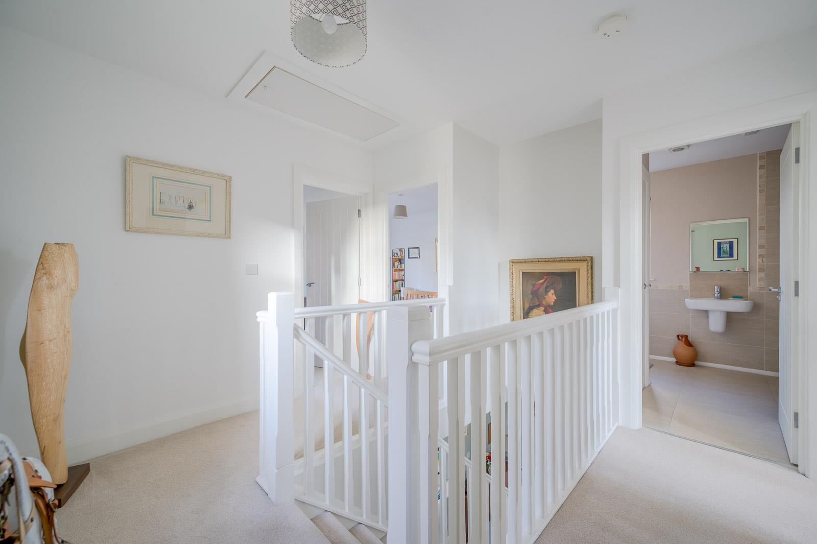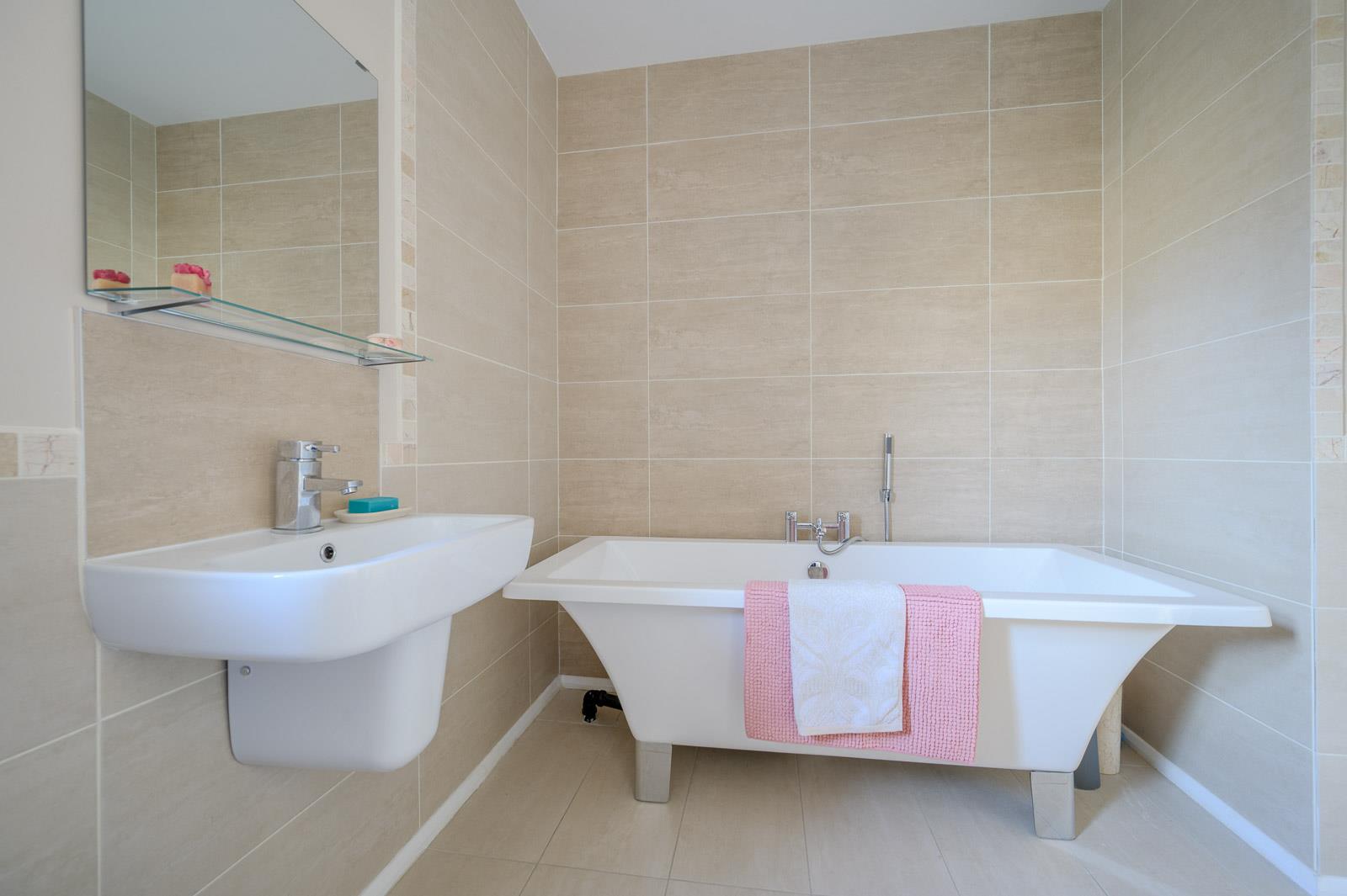 Three piece suite comprising free standing bath with mixer tap and hand shower, floating wash hand basin with mixer tap, tiled splashback, low flush WC, fully tiled floor, part tiled walls, extractor fan, shelved linen cupboard.