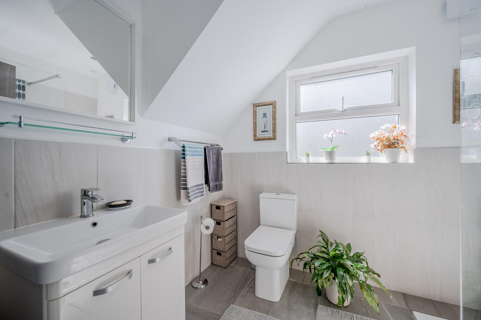Shower Room - Three-piece suite comprising shower cubicle, wash hand basin with mixer tap and storage beneath, low flush WC, fully tiled floor, part tiled walls, extractor fan.