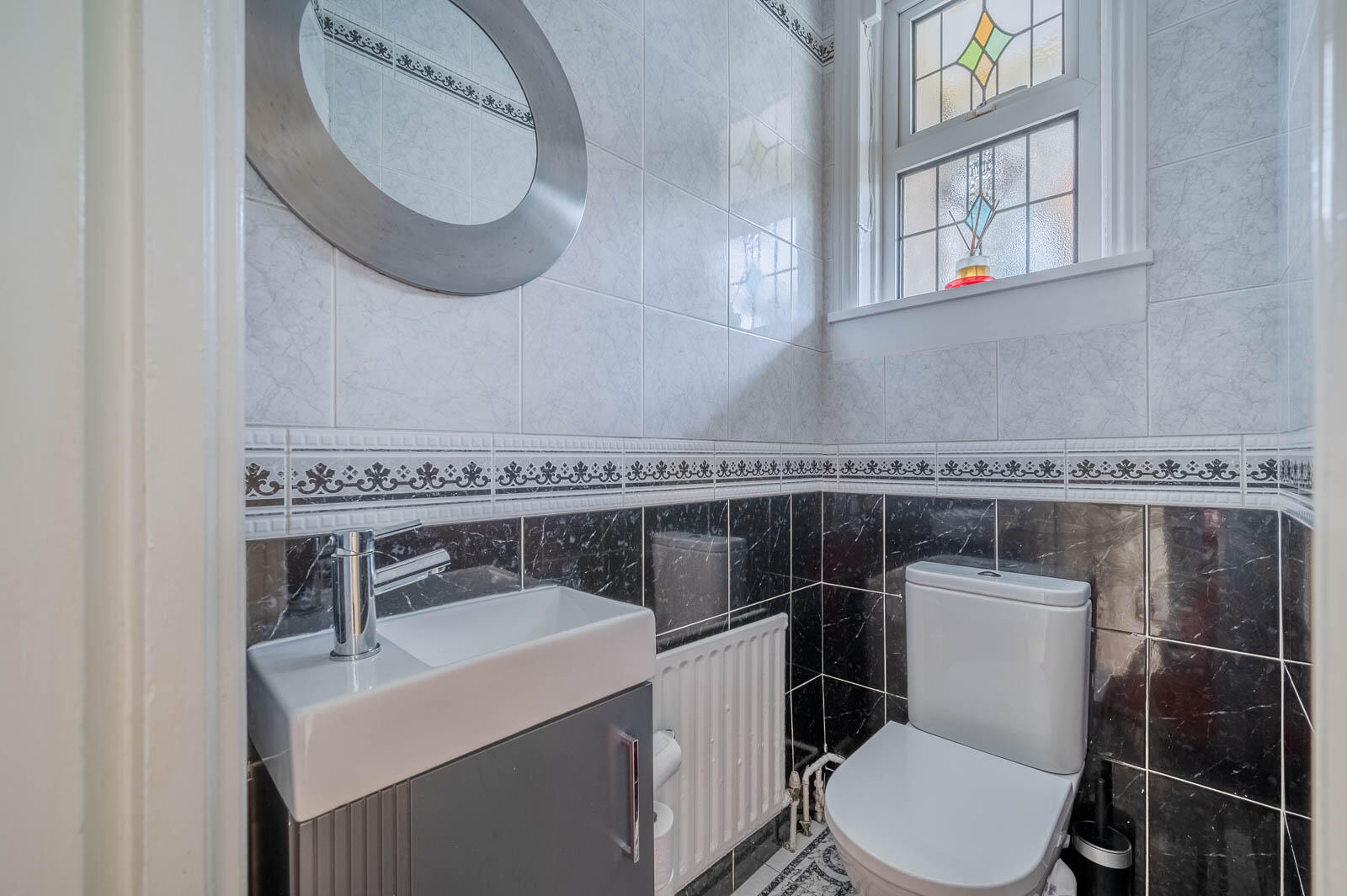 () - Two piece coloured suite comprising: low flush WC, pedestal wash hand basin, fully tiled floor, fully tiled walls, stained glass window.