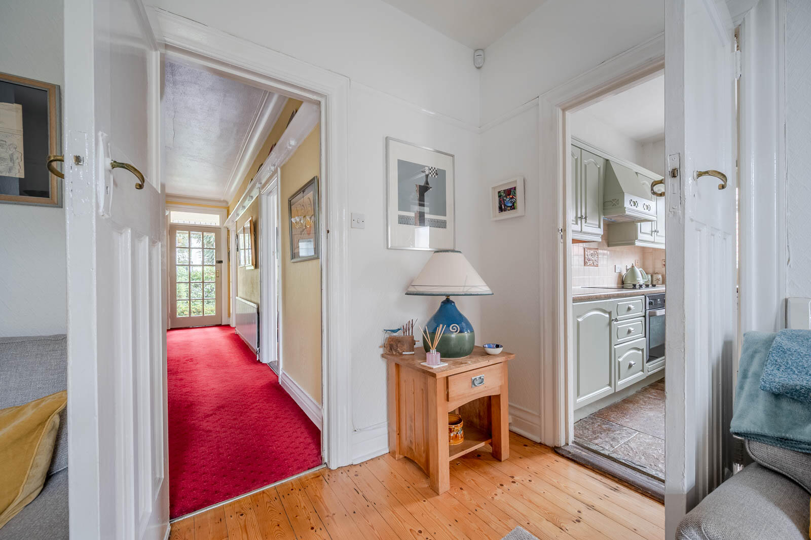 () - Cornice ceiling, plate display shelving, part wood panelled walls, storage cupboard under stairs with cloakroom area