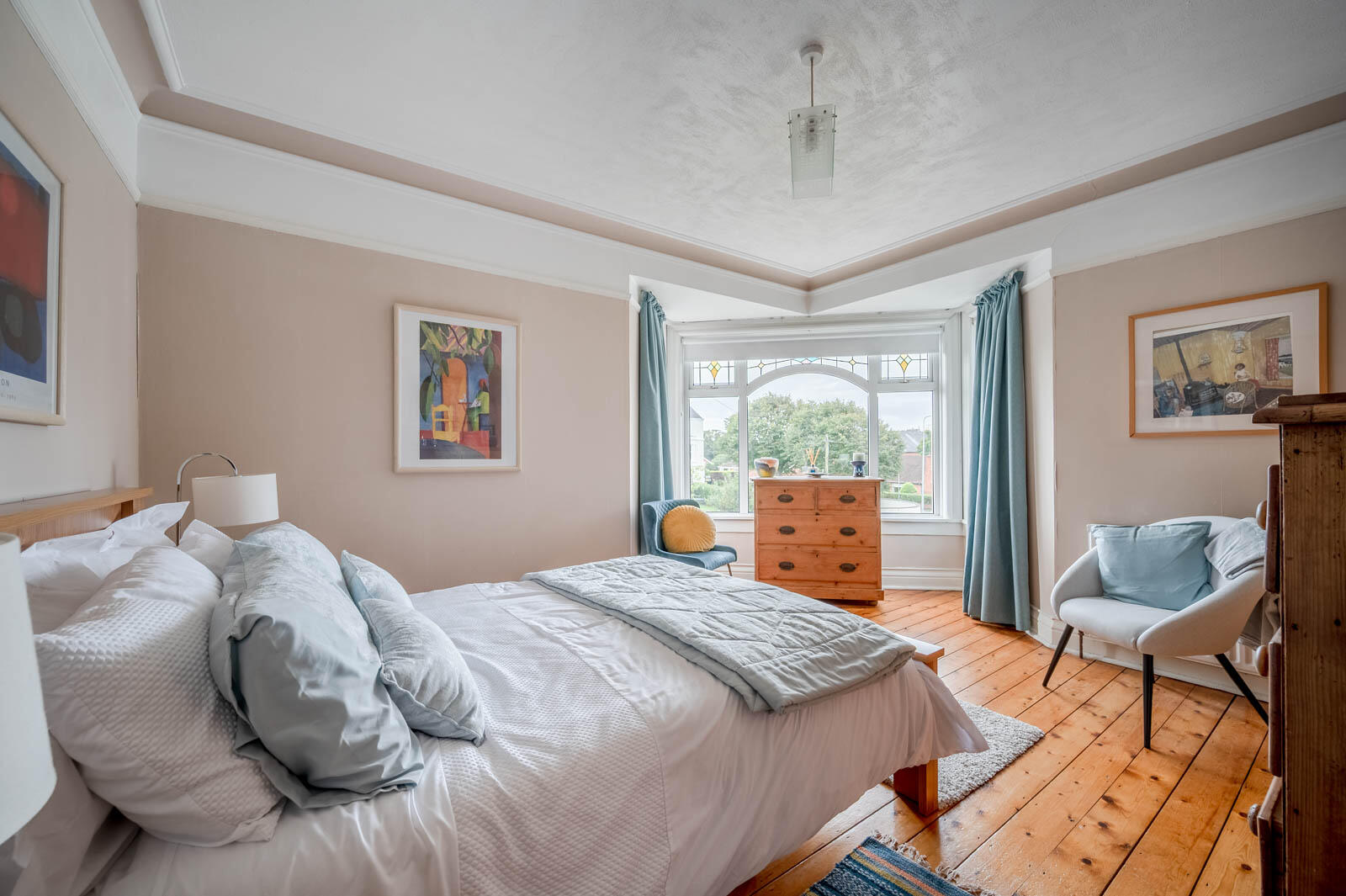 Wooden floorboards, cornice ceiling, picture rail, box bay window with stained glass top lights.