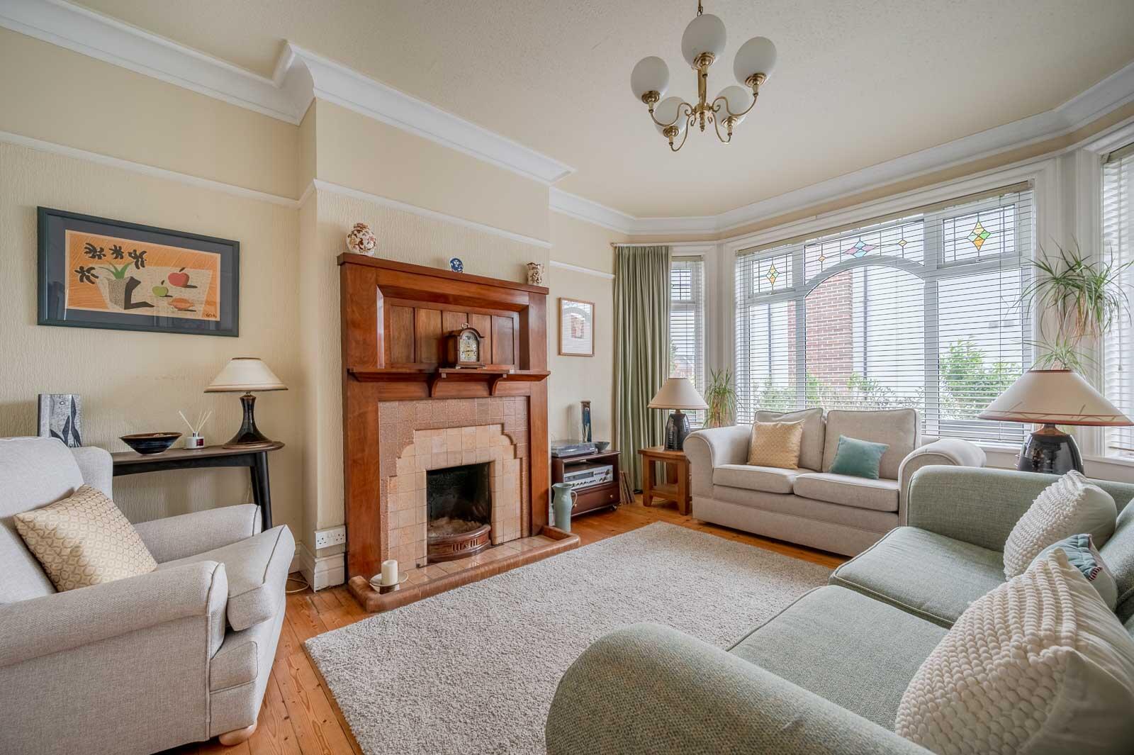 Attractive original fireplace with tiled inset, tiled hearth and open fire, solid wooden floorboards, picture rail, cornice ceiling, box bay window with stained glass top lights.