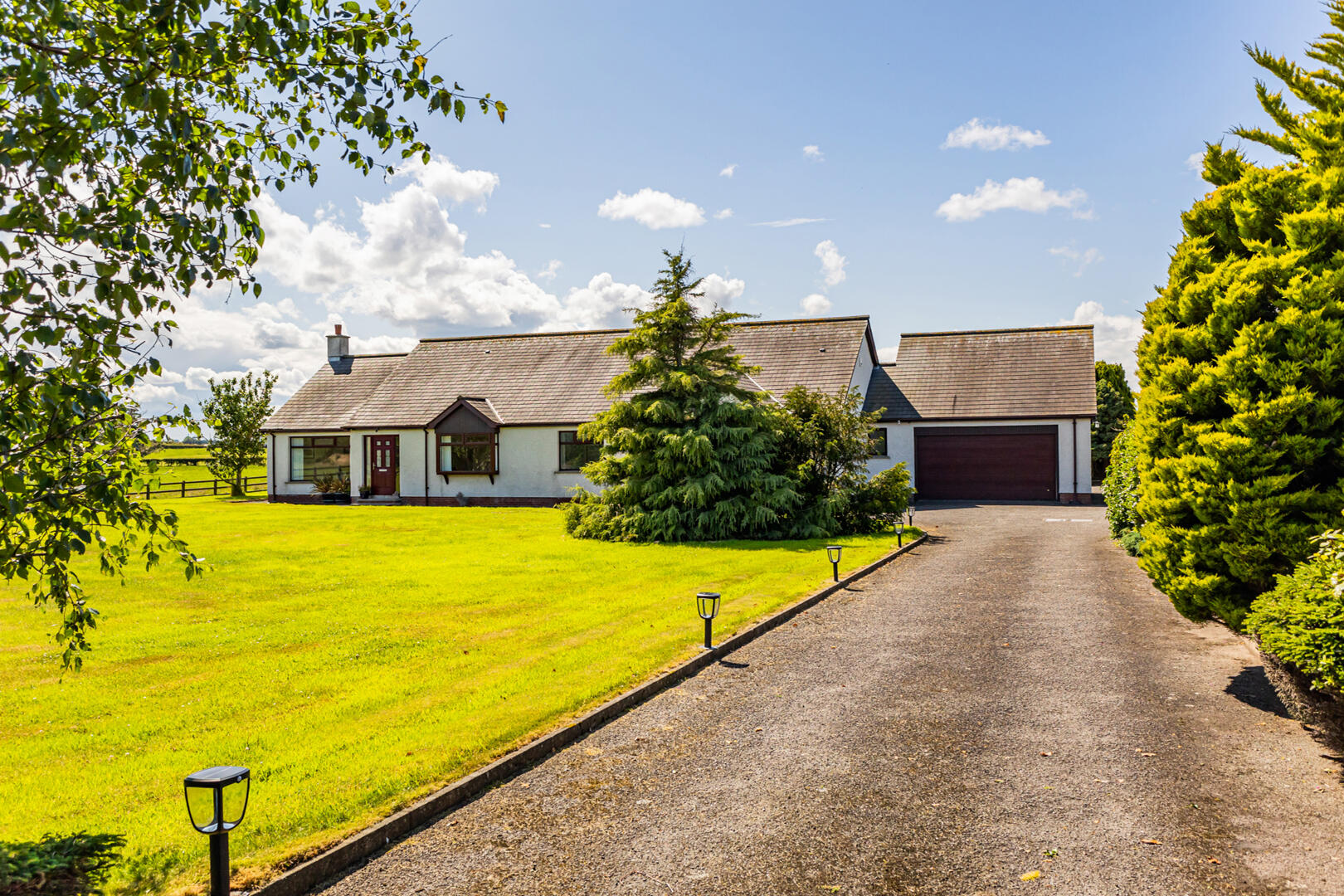 Well presented front garden in lawns with flowerbeds in plants and shrubs, driveway with parking leading to detached garage.