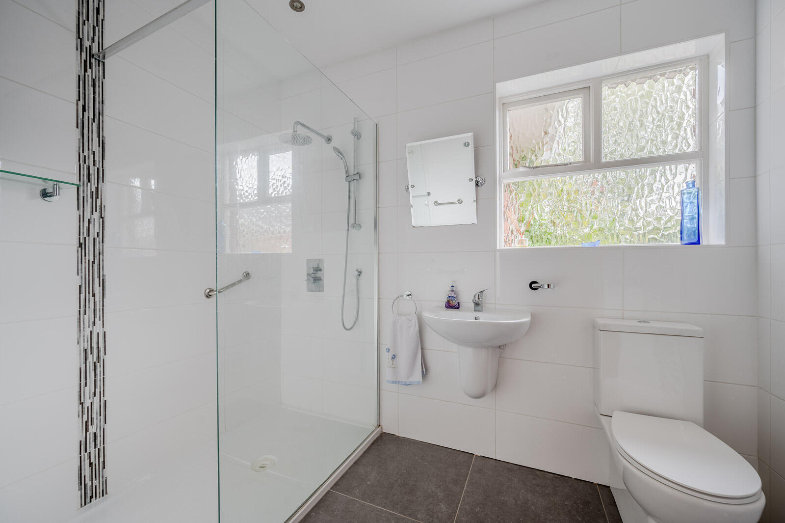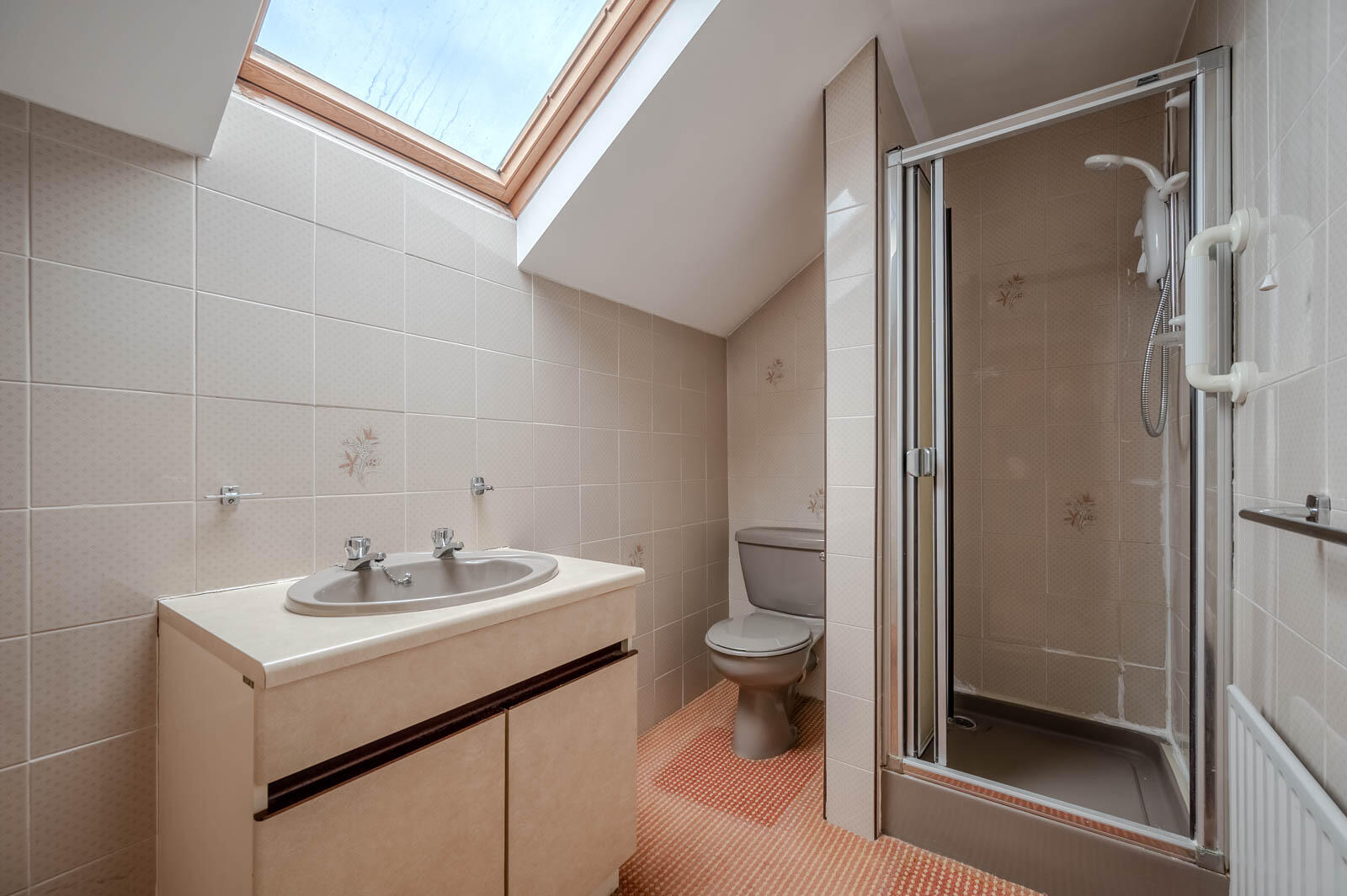 Three piece suite comprising built-in fully tiled shower cubicle with electric shower, low flush WC, wash hand basin with storage beneath, fully tiled walls.