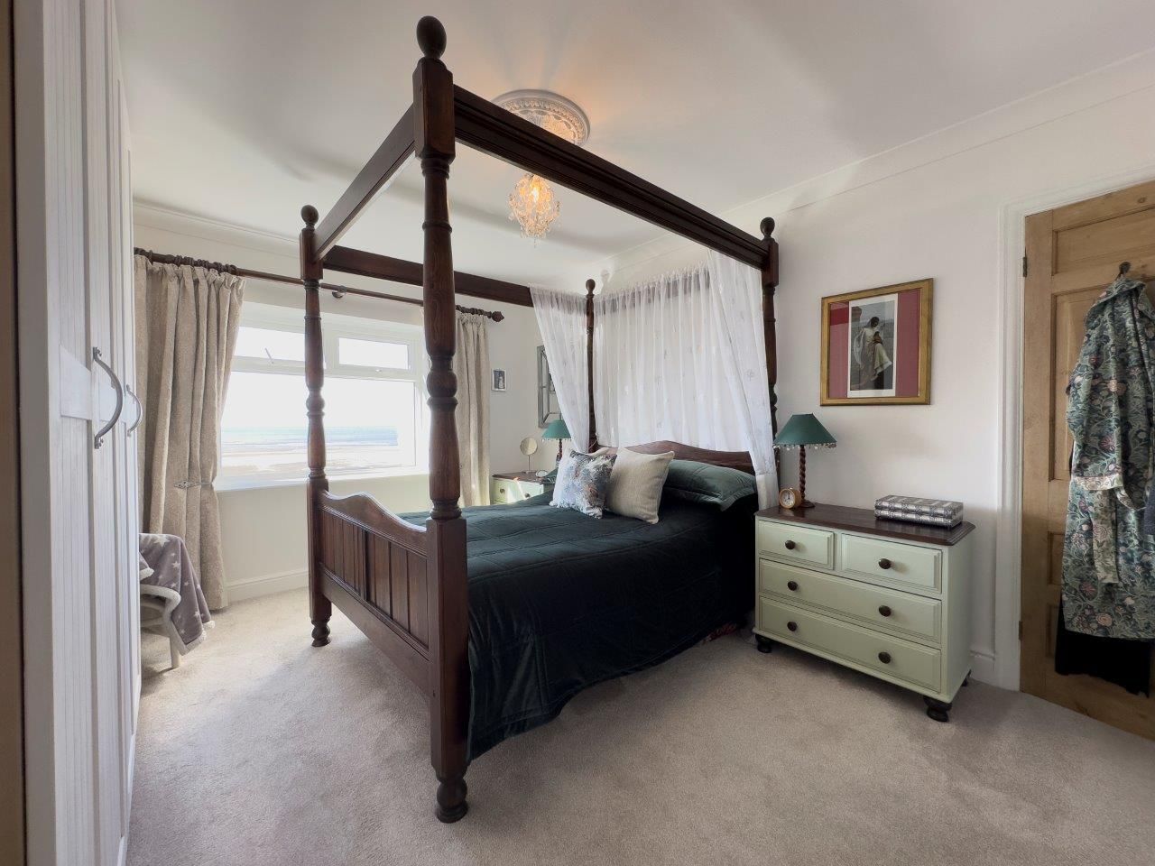 Picture window to front with sea views, coved ceiling, ceiling rose, original cast iron feature fireplace with tiled hearth, door to bathroom, TV and telephone points, radiator, carpet.